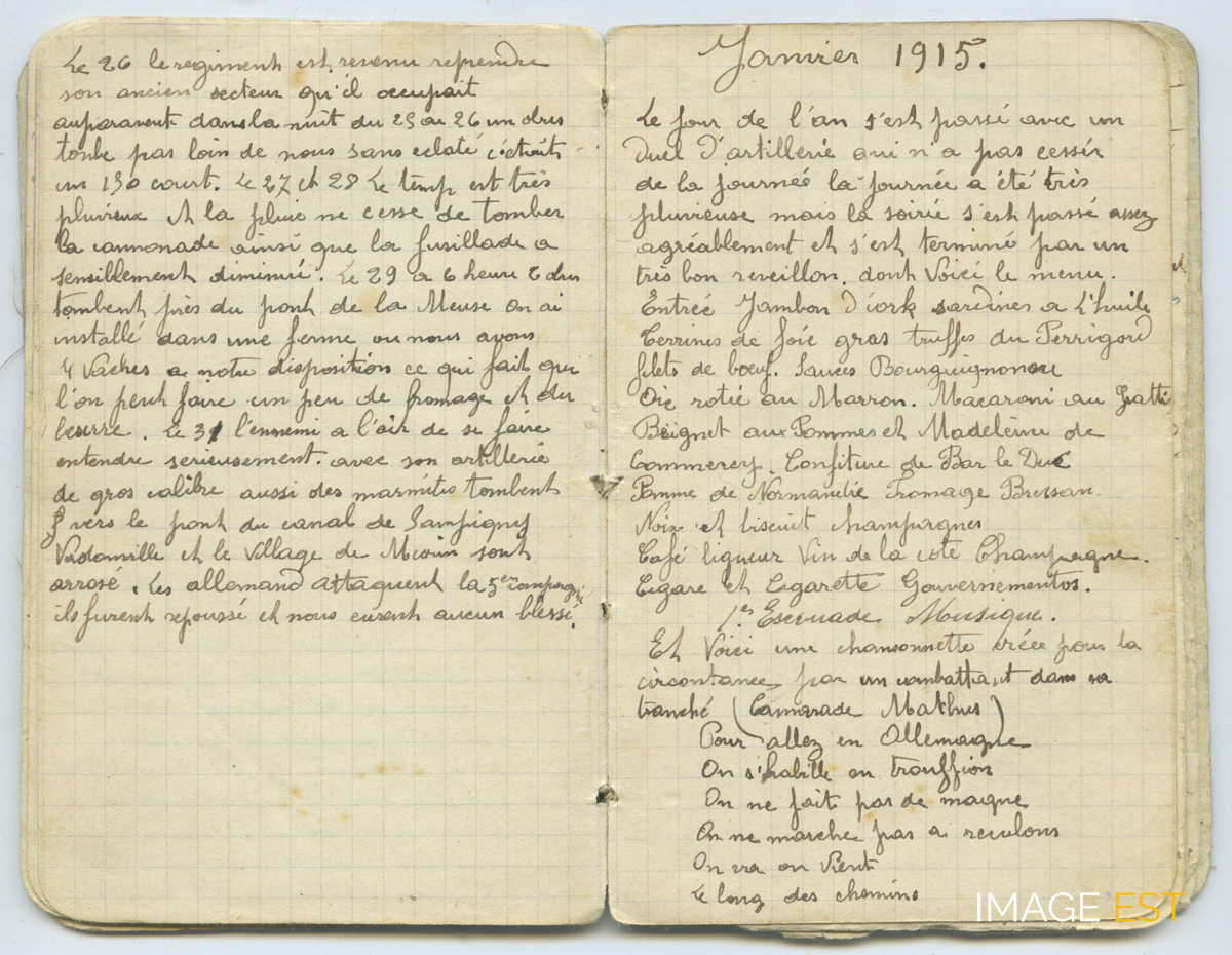 Page d'un journal intitulé « Mémoires de la campagne 1914 - Baron Émile, conducteur voiture médicale 56e infanterie Classe 1902 » composé par Émile Baron (1882-1938), né à Saint-Léger-sur Dheune (Saône-Loire). Le 26 décembre, le régiment est revenu à son ancien secteur, installé dans une ferme où il a à sa disposition quatre vaches ce qui lui permet de faire du fromage, il essuie des tirs ennemis plus ou moins nourris. Le 31 décembre, l'ennemi arrose à gros calibre le canal Sampigny-Vadonville, Mécrin et attaque sans succès la 5e compagnie. Janvier 1915. Duel d'artillerie le jour de l'an, mais la soirée se termine malgré tout par un bon réveillon, description du menu, musique et chanson écrite dans sa tranchée par le camarade Mathus.