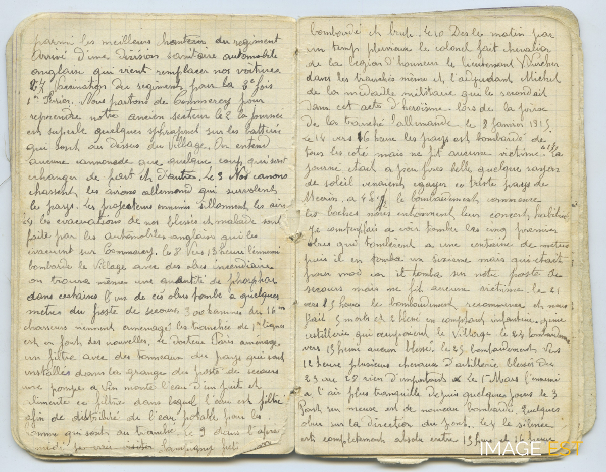 Page d'un journal intitulé « Mémoires de la campagne 1914 - Baron Émile, conducteur voiture médicale 56e infanterie Classe 1902 » composé par Émile Baron (1882-1938), né à Saint-Léger-sur Dheune (Saône-Loire). Arrivée d'une division sanitaire automobile anglaise en remplacement des voitures. Le 27 janvier, seconde vaccination du régiment. Le 1er février, retour à l'ancien secteur Mécrin (Meuse). Quelques coups de canons pour chasser les avions ennemis. Le 4 février, évacuation vers Commercy de blessés et malades par les véhicules anglais. Le 8 février, largage allemand de bombes incendiaires au phosphore, le docteur Paris met en place un filtre afin de distribuer de l'eau potable aux hommes des tranchées. Le 10 janvier, dans la tranchée même, le colonel décore les soldats qui ont fait preuve d'héroïsme lors de la prise de la tranchée allemande le 8 janvier 1915. Les jours suivants, les bombardements continuent " les boches entonnent leur concert habituel ".
