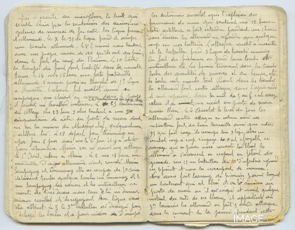 Page d'un journal intitulé « Mémoires de la campagne 1914 - Baron Émile, conducteur voiture médicale 56e infanterie Classe 1902 » composé par Émile Baron (1882-1938), né à Saint-Léger-sur Dheune (Saône-Loire). Le 4 mars, un grand silence permet d'écouter au microphone le bruit semblant venir des souterrains d'anciennes galeries de mine entre les lignes françaises et allemandes. Le 8 mars, l'ennemi bombarde avec nos propres canons pris au camp des Romains. Le 10 mars, toutes les troupes du front sont revêtues de la nouvelle tenue ( " à partir de 1915, un nouvel uniforme est adopté, l'uniforme dit « bleu horizon », mais il n'est pas généralisé avant l'automne 1916. Pour protéger la tête des Poilus, on équipe les soldats d'un casque en acier, le casque Adrian, du nom de son inventeur " source Musée de l' Armée https://www.musee-armee.fr/fileadmin/user_upload/Documents/Support-Visite-Fiches-Objets/Fiches-1914-1918/MA_fiche-uniformes-14-18-primaire.pdf). Le 14 mars, attaque allemande sur Brasseitte (Meuse), l'alerte est donnée, une bombe tombe sur la maison du médecin-chef, quelques chevaux sont tués. Le 28 mars, départ pour quelques jours de repos à Commercy (Meuse) mais aussitôt retour sur Mécrin (Meuse) par crainte d'une attaque imminente qui aura lieu le 2 avril, riposte réussie, on fait quelques prisonniers, les hommes trouvent des victuailles dans les tranchées ennemies, aucun blessé au poste de secours mais les Allemands contre-attaquent, alors s'engage un corps à corps effroyable.