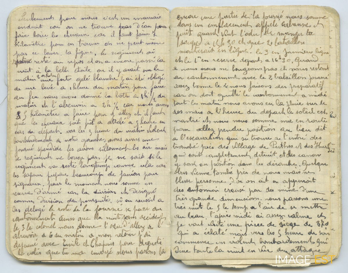 Page d'un journal intitulé « Mémoires de la campagne 1914 - Baron Émile, conducteur voiture médicale 56e infanterie Classe 1902 » composé par Émile Baron (1882-1938), né à Saint-Léger-sur Dheune (Saône-Loire). 1er octobre, le cantonnement du régiment n'est pas à un bon endroit : loin de tout point d'eau tant pour les hommes que les chevaux et il dort à la belle étoile. Le 3 octobre, le régiment reste en réserve d'armée, d'autres bataillons montent en ligne. Le 4 octobre, changement de position : à l'entrée des tranchées près des villages de Perthes et Hurlus (Marne) totalement détruits ; le 5 octobre, violent bombardement qui dure toute la nuit en vue d'une attaque.