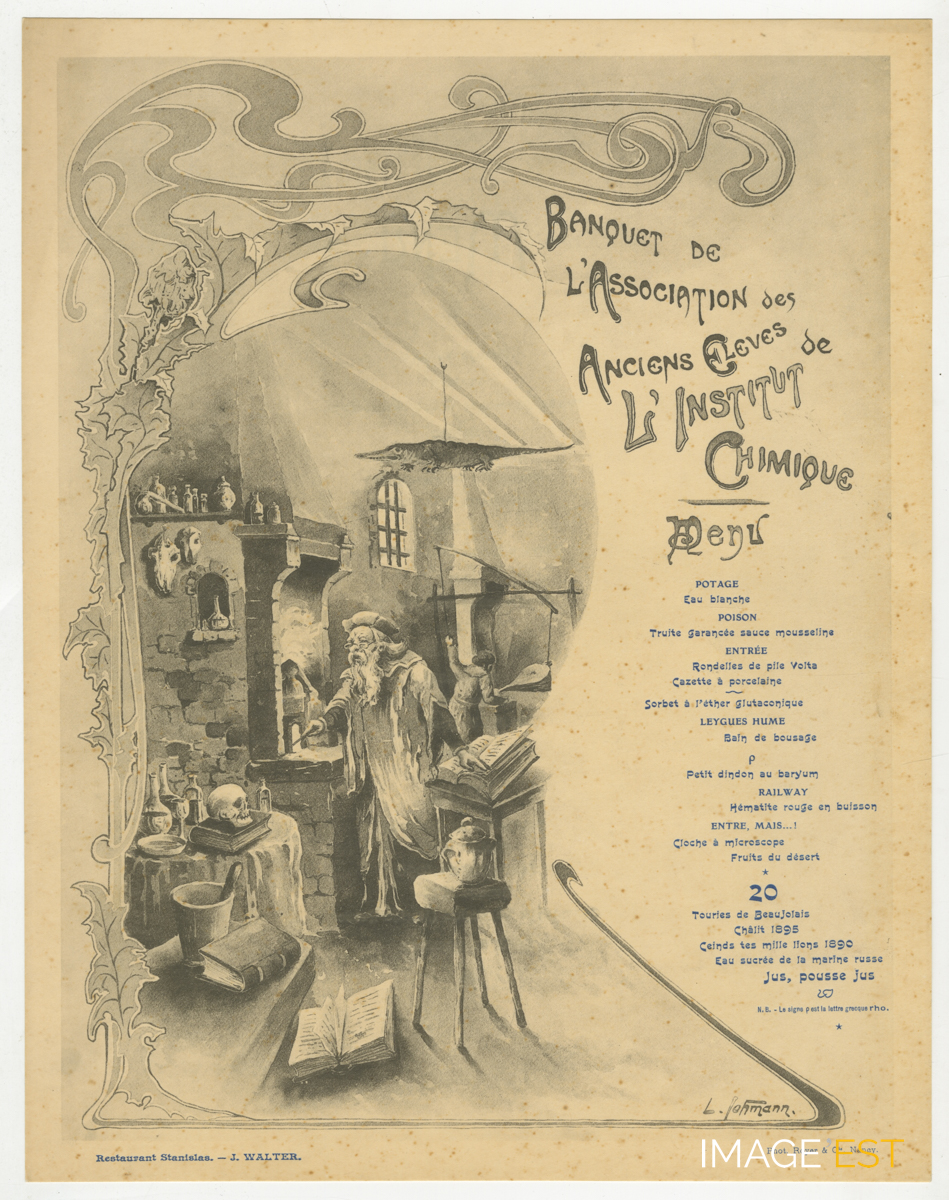 Menu d'un banquet de l'Associaiton des anciens élèves de l'Institut chimique de Nancy au restaurant Stanislas J. Walter, place Stanislas à Nancy (Meurthe-et-Moselle).