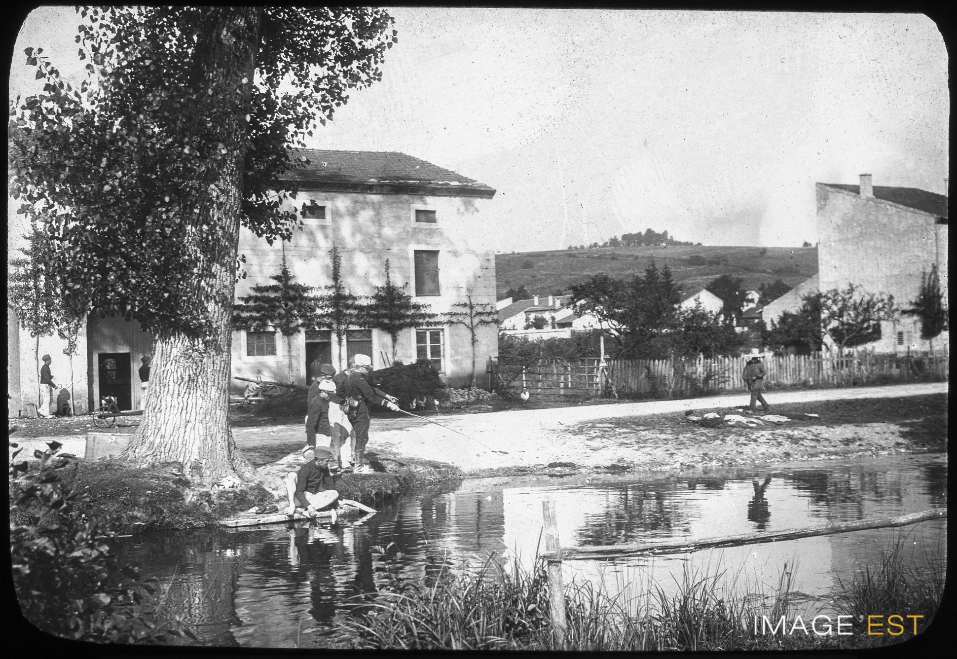 Militaires au repos dans leur cantonnement probablement à Ville-sur-Illon (Vosges). Une mention manuscrite en marge de la plaque de verre indique : " Aux Manoeuvres. Distractions au cantonnement. La pêche. "
