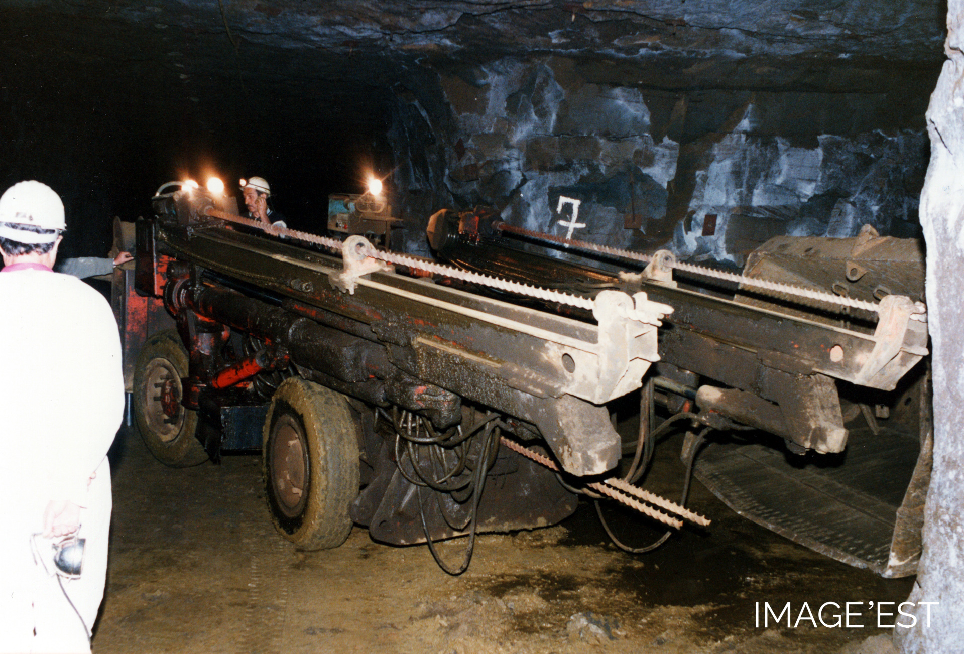 Perforation d'une paroi à l'aide d'un jumbo dans une galerie de la mine de fer du Paradis à Roncourt (Moselle) le 17 septembre 1992, deux mois avant la fermeture définitive du site. Le forage des trous (2 à 3 mètres de profondeur) en quartier de dépilage est la première opération d'exploitation et suit un " schéma de tir " préparé par les ingénieurs et le porion.