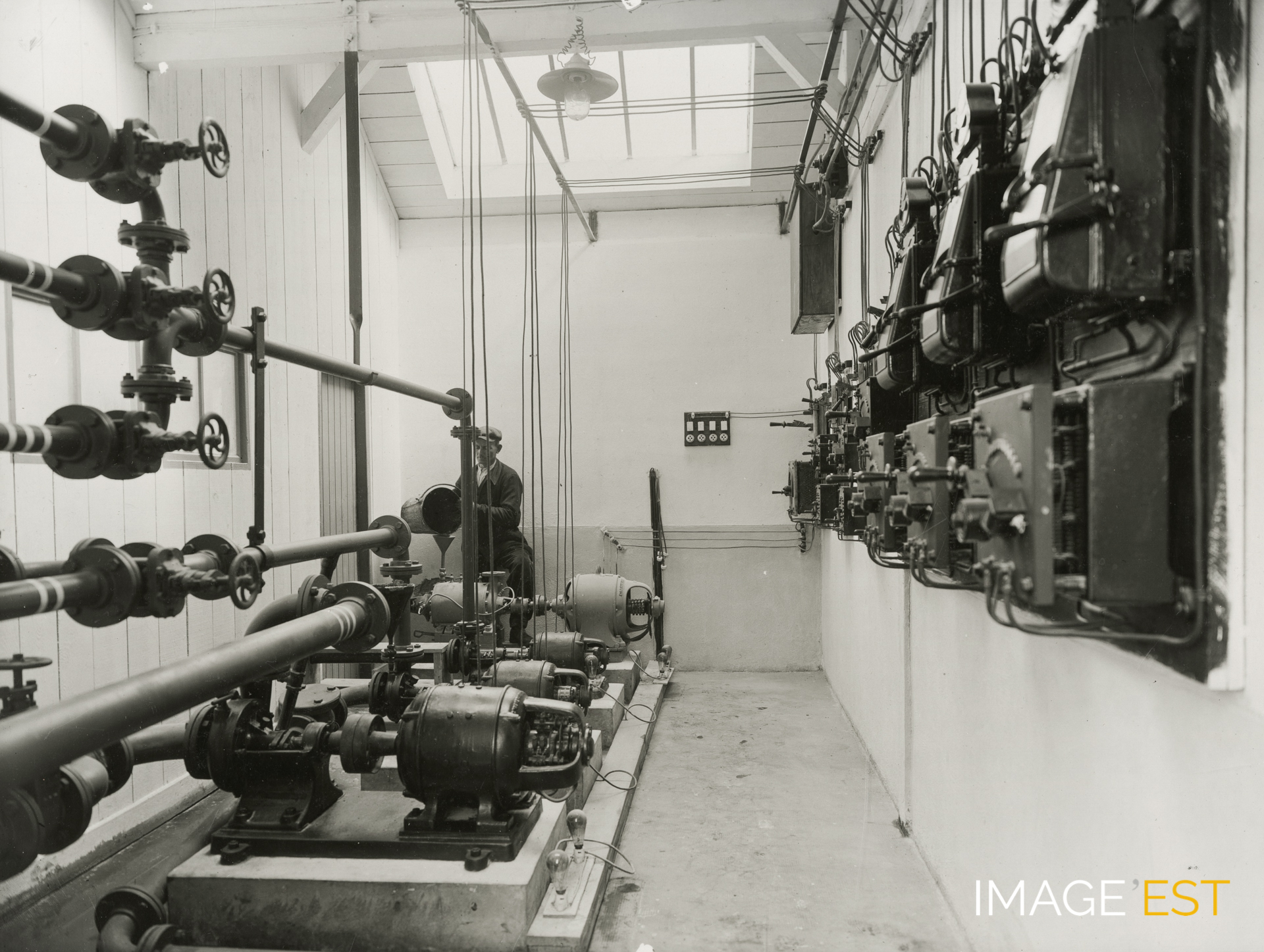 Pompe d'eau salée de la mine de sel et saline de Saint-Nicolas à Varangéville (Meurthe-et-Moselle). Cette photoghaphie contrecollée sur un carton est extraite de l'album Marcheville Daguin et Cie : Société du comptoir du sel et des produits chimiques de l'Est. Mine de sel et Saline de St Nicolas. Une légende dactylographiée en marge de cette photographie précise : " Pompe du bâtiment d'épuration d'eau salée ".