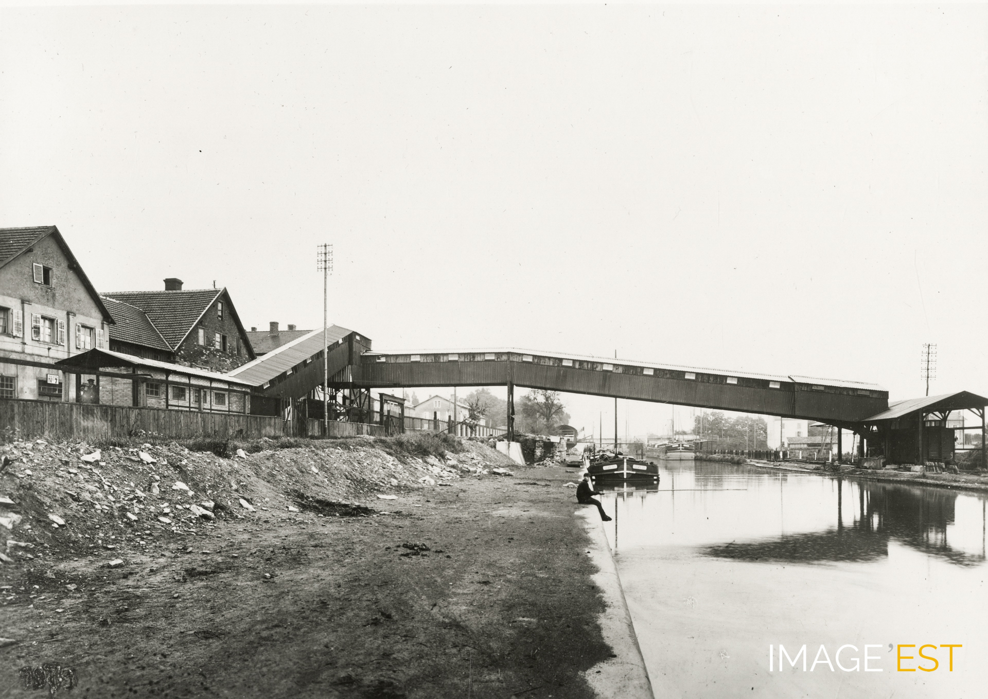 Passerelle de chargement sur wagons de la saline de Saint-Nicolas à Varangéville (Meurthe-et-Moselle). Cette photoghaphie contrecollée sur un carton est extraite de l'album Marcheville Daguin et Cie : Société du comptoir du sel et des produits chimiques de l'Est. Mine de sel et Saline de St Nicolas. Une légende dactylographiée en marge de cette photographie précise : " Passerelle de chargement sur wagons (ensemble) ".