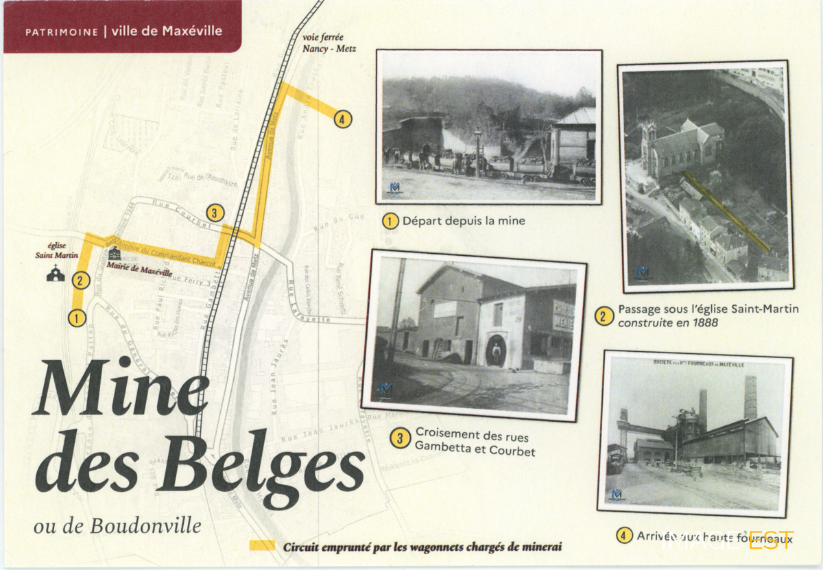 Carte éditée à l'occasion de l'installation du panneau indicatif in-situ à Maxéville (Meurthe-et-Moselle) de la Mine des Belges ou de Boudonville. Un itinéraire en jaune indique les lieux traversés par les wagonnets chargés de minerai : 1. Départ de la mine ; 2. Passage sous l'église Saint-Martin ; 3. Au croisement des rues Gambetta et Courbet ; 4. Arrivée au hauts fourneaux. L'autorisation d'exploitation fut accordée en 1865, tandis que la cessation de l'activité et la fermeture de la mine euront lieu en 1939 (Lien vers le blog de l'association Mémoire de Maxévlle : https://www.memoiremaxeville.com/archives/2023/05/07/39897739.html)