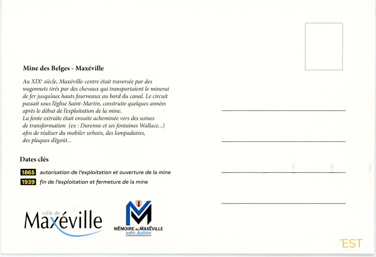 Carte éditée à l'occasion de l'installation du panneau indicatif in-situ à Maxéville (Meurthe-et-Moselle).Quatre photographiess indiquent un itinéraire des wagonnets chargés de minerai au départ de la mine (1) avant d'emprunter le passage construit en 1888 sous l'église Saint-Martin.L'autorisation d'exploitation fut accordée en 1865, tandis que la cessation de l'activité et la fermeture de la mine euront lieu en 1939 (Lien vers le blog de l'association Mémoire de Maxévlle : https://www.memoiremaxeville.com/archives/2023/05/07/39897739.html).