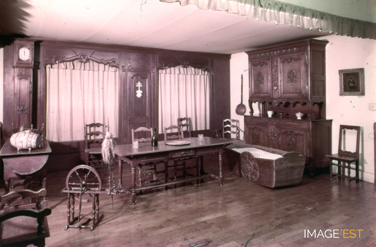 Mobilier d'une salle du Musée lorrain (Art et traditions populaires de Lorraine). En marge de la diapositive figure la mention : " 2 - " Salle avec buffet de Blanzey et lits en alcôve de Lamarche ". Séries de diapositives sélectionnées et commentées par Jean Hurstel, directeur du Service éducatif des Musées de l'Académie de Nancy-Metz.