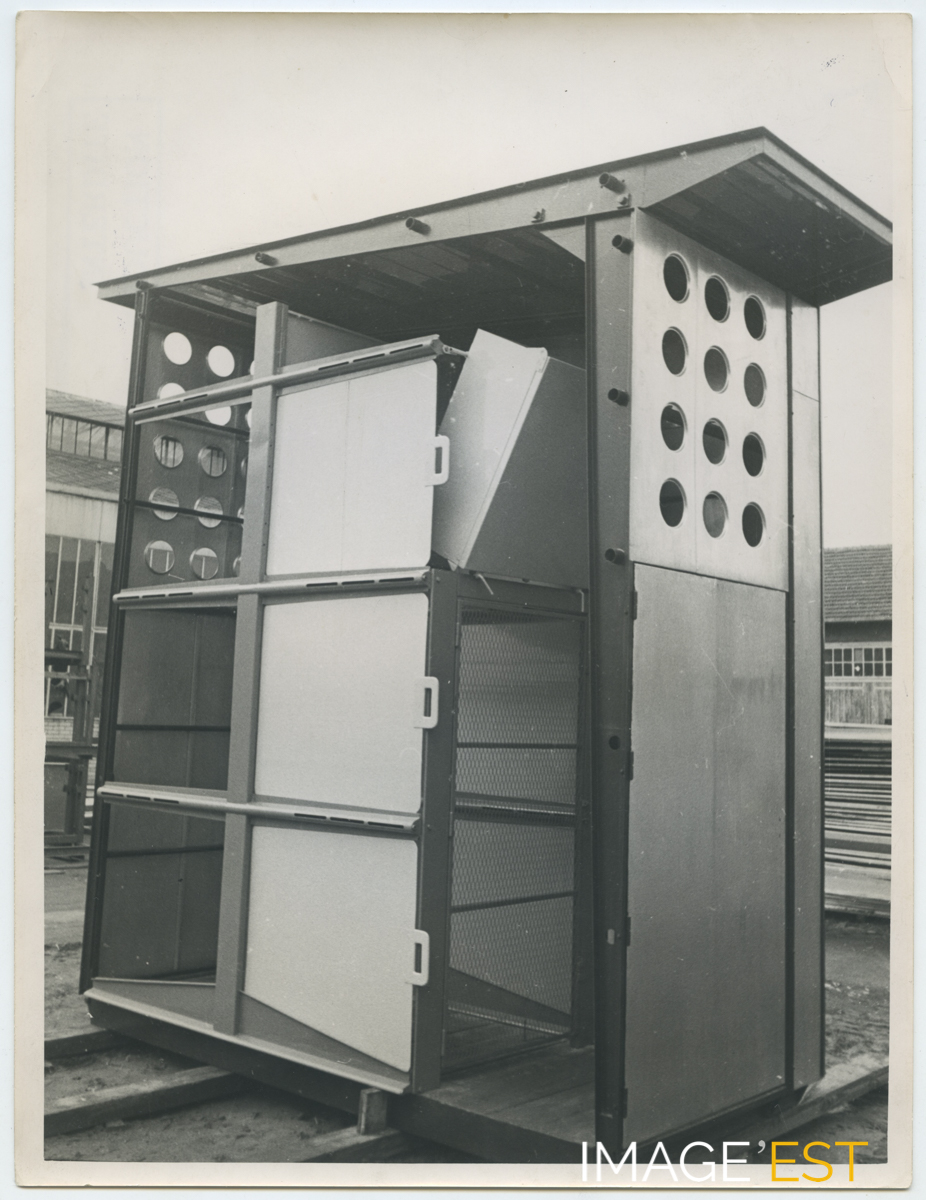 Montage d'éléments au sein de l'atelier Jean Prouvé à Maxéville (Meurthe-et-Moselle). Au verso de ce document, figure la mention : " TEMEG - Travaux d'études et de montage d'électrification générale ".