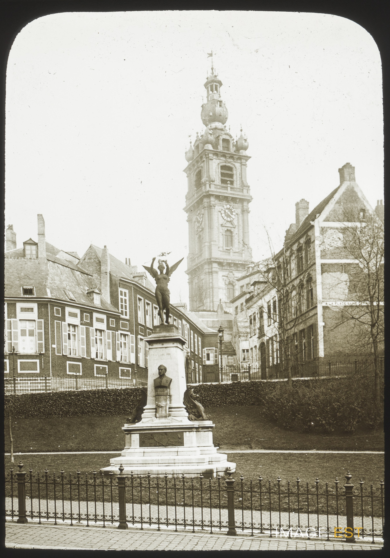 Monument à François Dolez (1806-1883) et Beffroi à Mons. Une mention manuscrite en marge de la plaque de verre indique : " Mons. La Statue de François Loly et le Beffroi. "