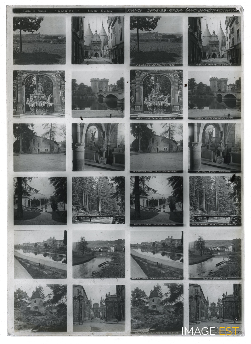 Série de 24 vues montrant la fontaine d'Amphitrite, les grilles Jean Lamour avec en perspective la cathédrale et la porte de la Craffe à Nancy (Meurthe-et-Moselle), une vue sur le village et la maison de Jeanne d'Arc à Domremy-la-Pucelle (Vosges)... Une mention manuscrite en haut de la plaque indique : " Made in France " Educa " - Breveté S.G.D.G France Série : 39 - Verdun - Nancy - Domremy - Vaucouleurs ". Une annotation figure sous certaines vues : " Panorama de Neufchâteau - Nancy porte de Craffe - Nancy : fontaine d'Amphitrite - Verdun : porte Chaussée (XVe Se) - Domremy : maison de Jeanne d'Arc - Vaucouleurs : la crypte - Vittel : l'établissement thermal - Kichompré : Pont Marie-Louise - Verdun : bords de la Meuse et cathédrale - Vue de Domremy - Vaucouleurs : porte de France - Nancy : grilles de Jean Lamour, église Saint-Jean ". Il pourrait s'agir d'une plaque destinée a être visionnée dans le domaine de l'Education. (Ecole de Danne et Quatre vents (Moselle). Sur chaque plaque de verre, on trouve deux colonnes doubles de six photographies stéréoscopiques placées en rangée. Concernant les plaques stéréoscopiques, on peut s'interroger sur la nature des représentations véhiculées par l'intermédiaire de la collection la plus diffusée, à savoir la Géographie illustrée de la France. Chaque vue stéréoscopique possède sa propre légende inscrite dans la partie inférieure, et chaque plaque intègre en son milieu son numéro de série et son intitulé.(Source : Nicolas Le Guern, « La stéréoscopie dans les salles de classe. Le cas du stéréoscope Educa dans la France de l'entre-deux-guerres », Transbordeur [En ligne], 8 | 2024, mis en ligne le 15 février 2025, consulté le 28 octobre 2025. URL : http://journals.openedition.org/transbordeur/1456 ; DOI : https://doi.org/10.4000/12gy7).