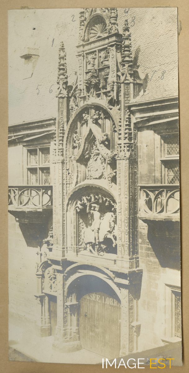 Ancienne entrée du Musée lorrain Grande Rue à Nancy (Meuethe-et-Moselle). À remarquer sous la statue équestre, l'inscription " Musée lorrain ".