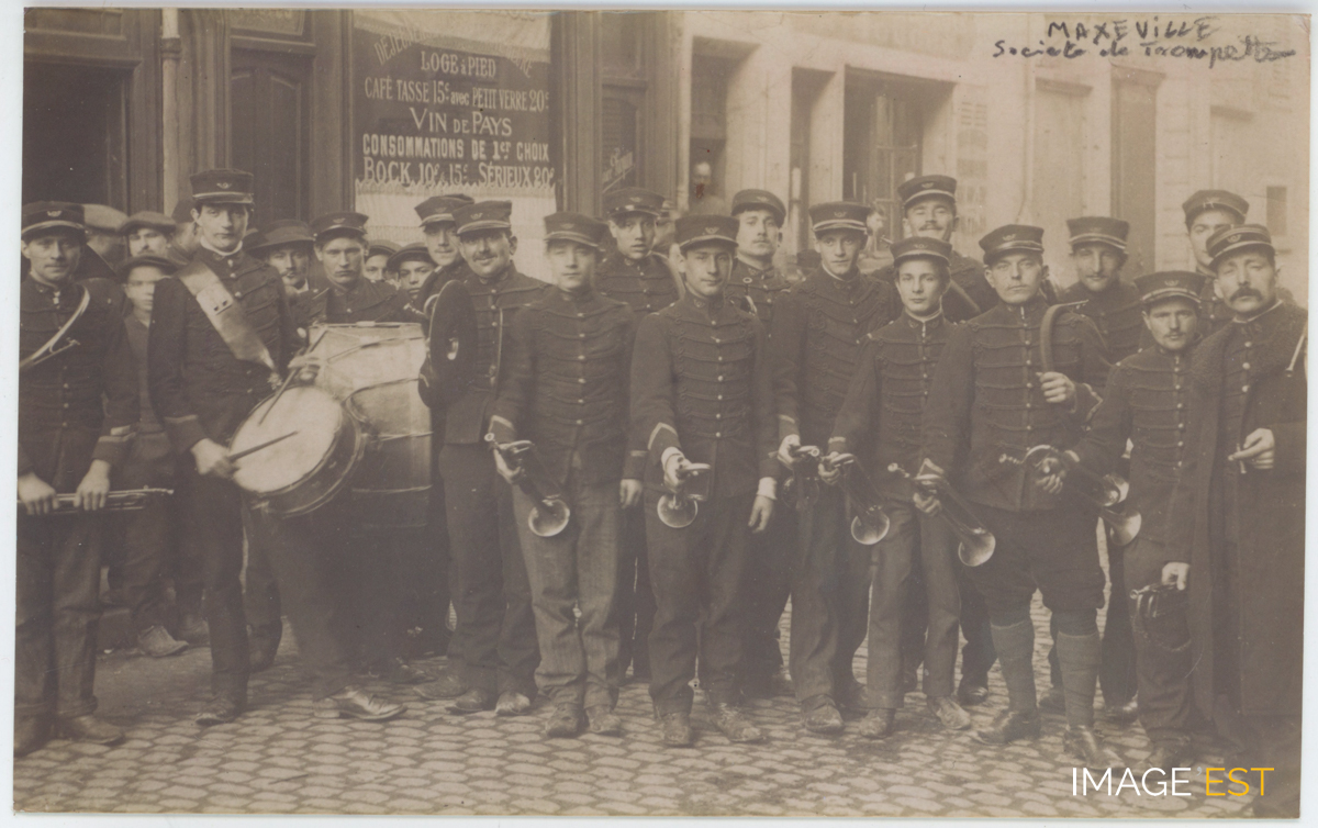 Un groupe de musiciens d'une fanfare posant devant la devanture d'un café-restaurant d'un lieu non identifié. Une inscription en haut à droite indique " Maxéville - société de trompettes ".