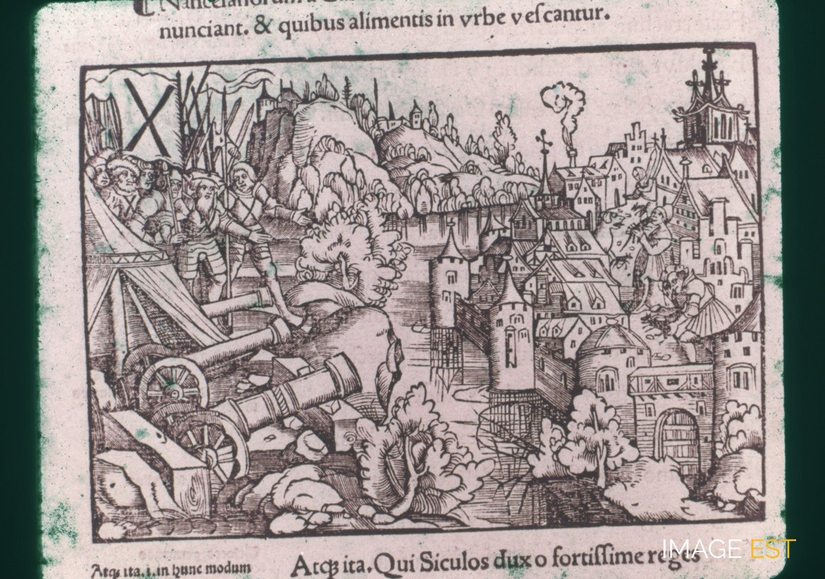 La bataille de Nancy (1477). Bois gravé illustrant la famine dans Nancy assiégée, en hiver 1476, extrait de la Nancéide, oeuvre de propagande au service de la maison de Lorraine en vers latins qui sera traduite en français au début du XVIIe siècle puis en 1840. En marge de la diapositive figure la mention : " 4. La famine dans Nancy assiégée Hiver 1476-1477 Bois gravé de la Nancéide. 1519 ". Séries de diapositives sélectionnées et commentées par Jean Hurstel, directeur du Service éducatif des Musées de l'Académie de Nancy-Metz.