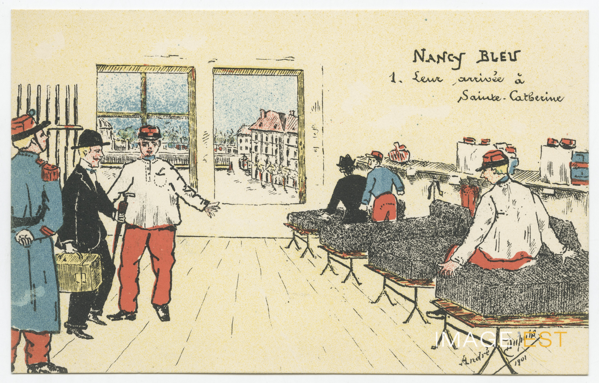 Carte postale signée André Dupuis (1876-1974), illustrant l'arrivée des " Bleus " à la caserne Thiry rue Sainte-Catherine à Nancy (Meurthe-et-Moselle). Né à Langres en 1876, André Dupuis effectue ses études à l'École des Beaux-arts de Nancy de 1900 à 1904 avant de disparaître mystérieusement de cette ville (Source : http://andredupuisnancy1900.free.fr/).