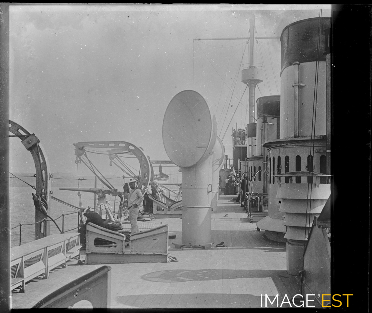Navire militaire français à quai. À remarquer un groupe de visiteurs à l'arrière-plan.