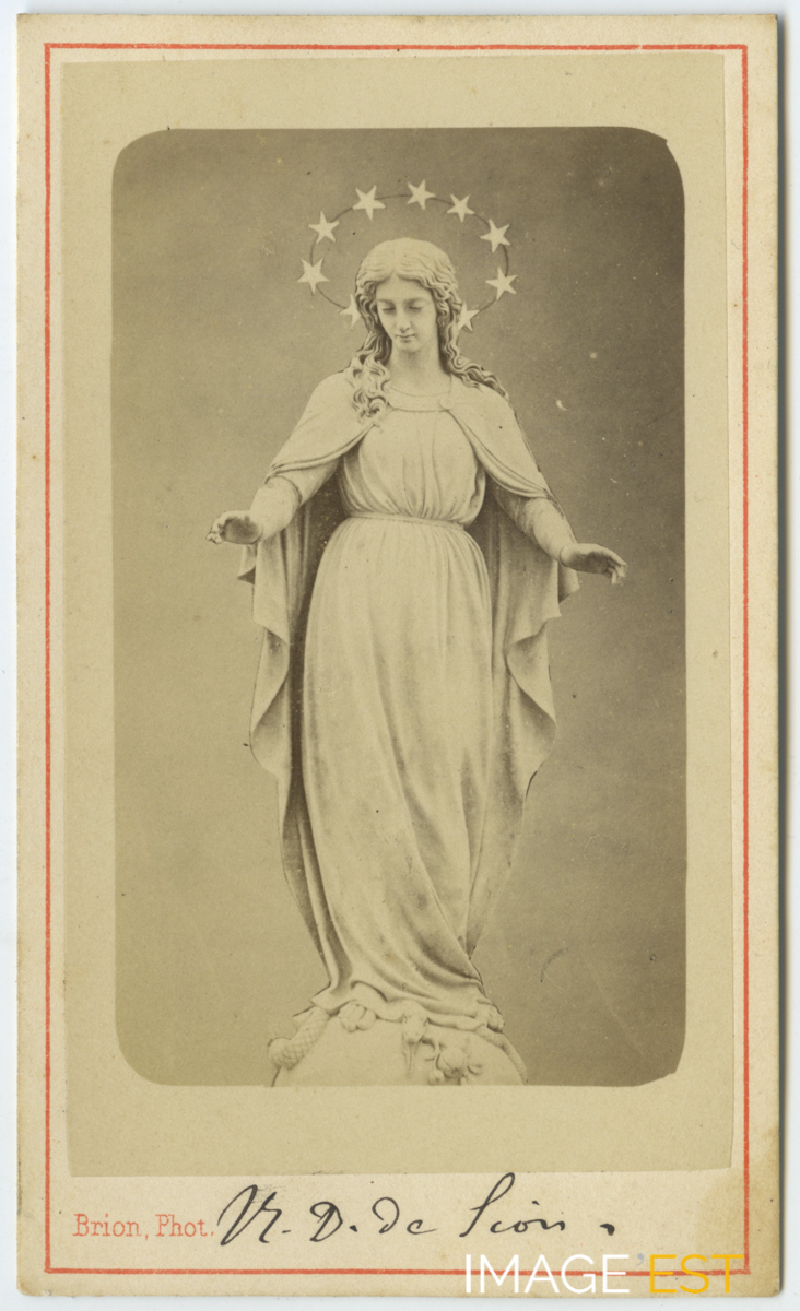 Statue de la Vierge Notre-Dame de Sion à Saxon-Sion (Meurthe-et-Moselle). Cette photographie est extraite d'un album contenant des portraits de nombreux prêtres ayant exercés dans le département des Vosges entre 1870 et 1910 environ. " Le 10 septembre 1873, sous la présidence du cardinal Mathieu, archevêque de Besançon, en présence d'une dizaine d'évêques dont Mgr Grandin et du père Soullier, devenu assistant général, l'ensemble est inauguré solennellement et la statue de Notre-Dame de Sion est couronnée. On parle de 30 000 pèlerins ce jour-là, dont près de 1500 prêtres, et au total de près de 70 000 pèlerins pour les festivités qui durent toute la semaine. Dans le sanctuaire, un petit monument commémoratif confie à Notre-Dame la souffrance de la Lorraine désormais traversée par une frontière: «Ce n'a me po tojo!» Ce n'est pas pour toujours, en patois lorrain. La Lorraine se trouvait réunie ce jour-là autour de Notre-Dame de Sion. Cette fête couronne aussi l'½uvre de reconstruction entreprise depuis vingt ans par les Oblats. Elle restera emblématique du caractère à la fois religieux et patriotique du sanctuaire " (Source : https://www.omiworld.org/fr/lemma/notre-dame-de-sion-fr/)