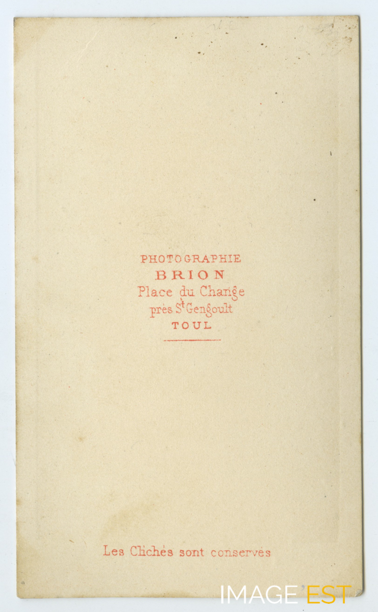 Portrait-carte de visite photographe A. Brion installé place du Change à Toul (Meurthe-et-Moselle). Cette photographie est extraite d'un album contenant des portraits de nombreux prêtres ayant exercés dans le département des Vosges entre 1870 et 1910 environ.