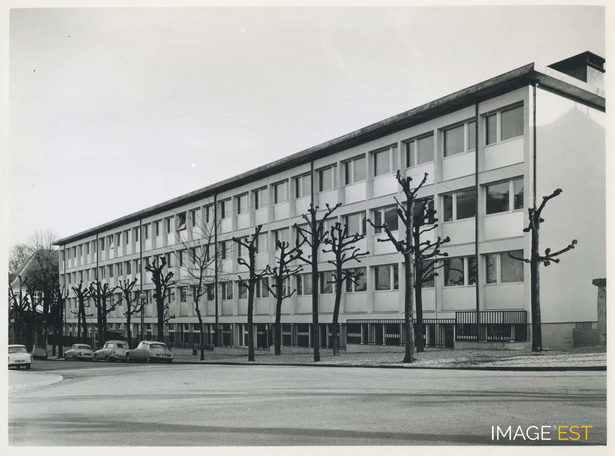 Façade du nouveau bâtiment de l'École nationale supérieure des industries chimiques, rue Déglin à Nancy (Meurthe-et-Moselle). Cachet du photographe Charles André (N°10 2951) au verso.