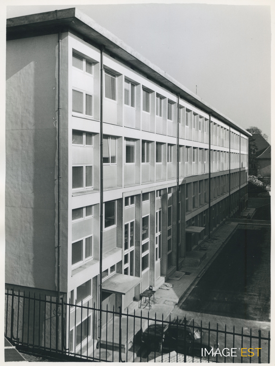 Façade du nouveau bâtiment de l'École nationale supérieure des industries chimiques, rue Déglin à Nancy (Meurthe-et-Moselle). Cachet du photographe Charles André (N°9 2951) au verso.