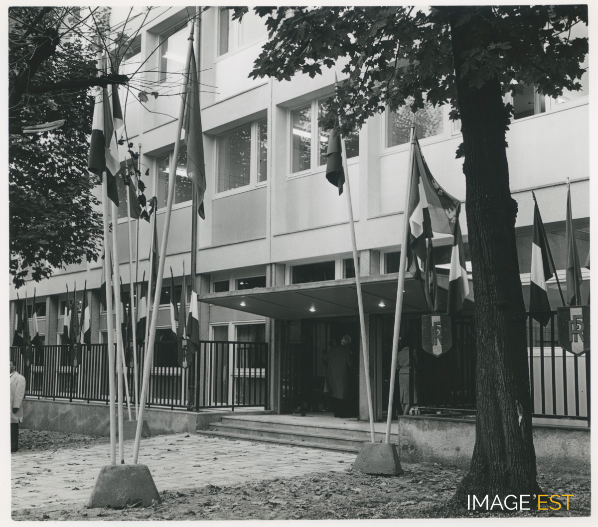Entrée du nouveau bâtiment de l'École nationale supérieure des industries chimiques, rue Déglin à Nancy (Meurthe-et-Moselle). Cachet du photographe Charles André (N°2-1167) au verso.