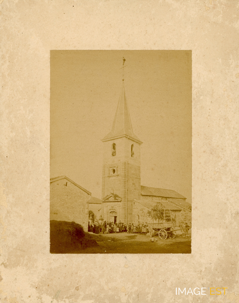 Rassemblement de paroissiennes et de paroissiens devant l'église Saint-Brice à Dombrot-le-Sec (Vosges) à l'occasion de la bénédiction du nouveau clocher de l'édifice en août 1890. On remarquera sur cette photographie la différence de teinte du bâti entre la partie inférieure du clocher et celle supérieure, reconstruite après un incendie causé par la foudre, le 8 juin 1889. La construction de l'église a commencé au XIIIe et a été remaniée au XVIe siècle. La tour a été reconstruite en 1790. Au-dessus du fronton trône une statue en pierre, une Vierge à l'Enfant, rapatriée depuis à l'intérieur. Au sommet du clocher, un homme installe le coq au-dessus de la croix.
