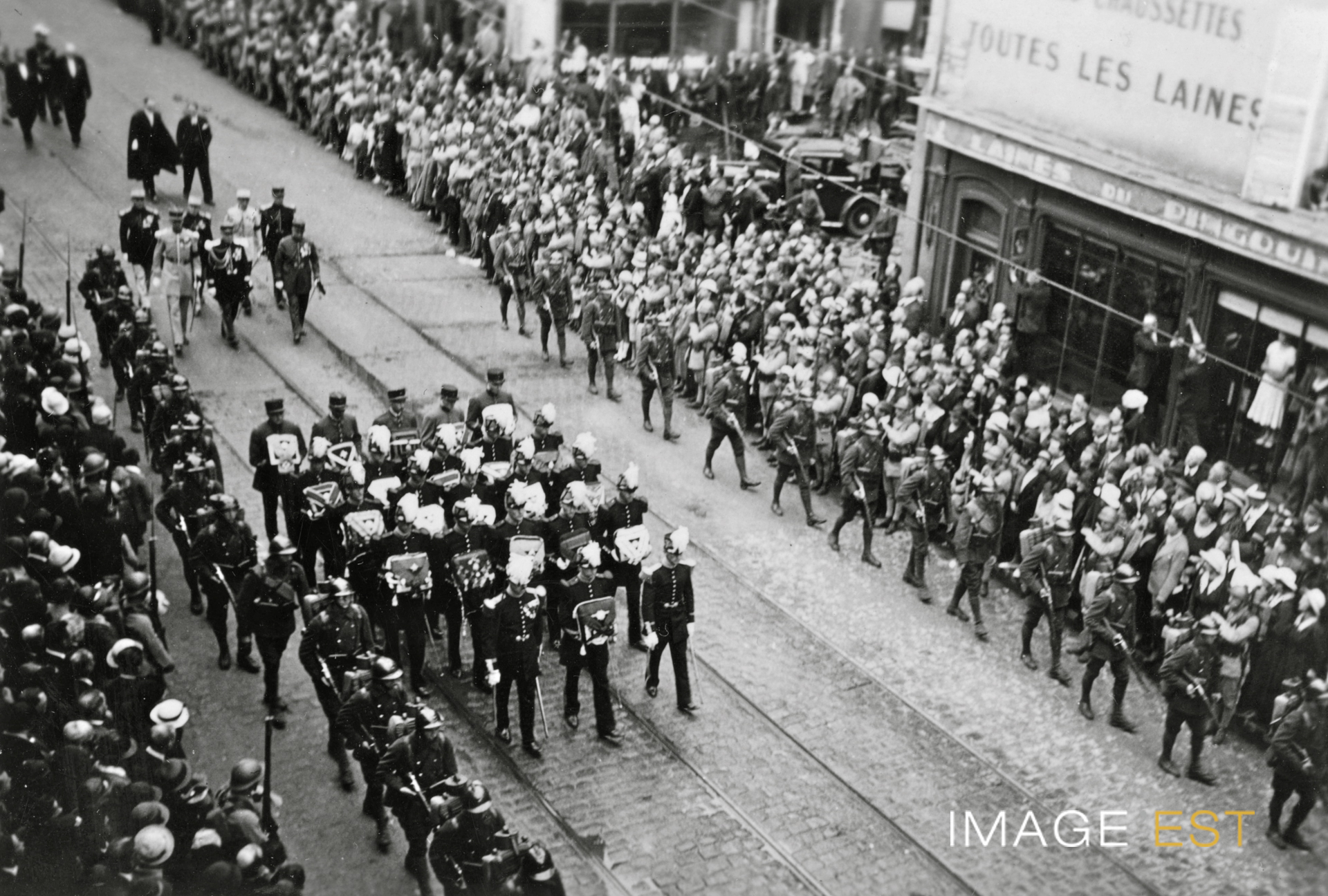 Élèves officiers saint-cyriens portant chacun un coussin avec une décoration épinglée, photographiés lors des obsèques du maréchal Lyautey (1854-1934) le 2 août 1934, rue Saint-Dizier à Nancy (Meurthe-et-Moselle). Au verso du document figure la mention manuscrite suivante : « St-Cyriens pendant les décorations ».