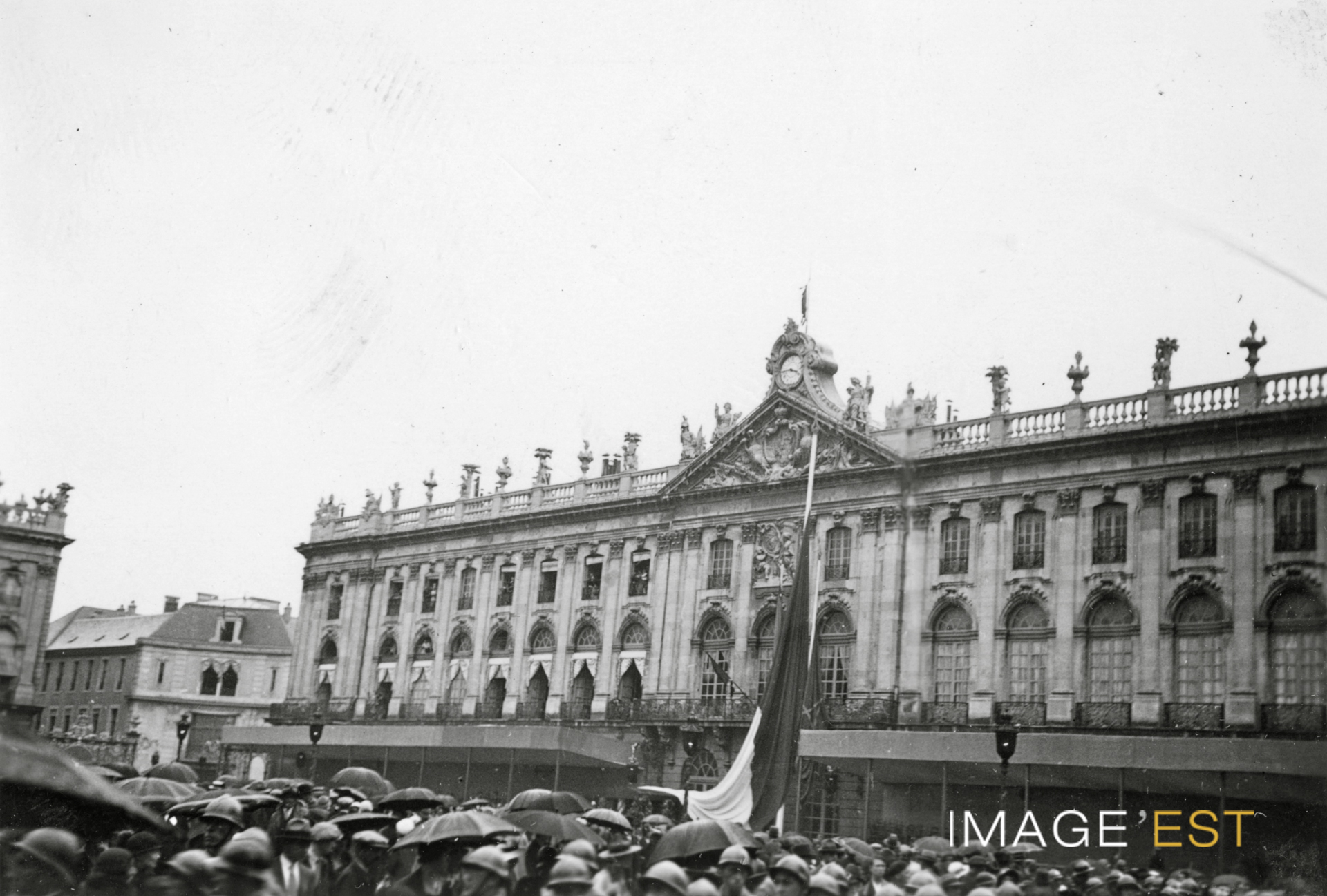 Foule devant l'hôtel de ville place Stanislas à Nancy (Meurthe-et-Moselle) lors des obsèques du maréchal Lyautey (1854-1934) le 2 août 193. Au verso du document figure la mention manuscrite suivante : « La mairie ».