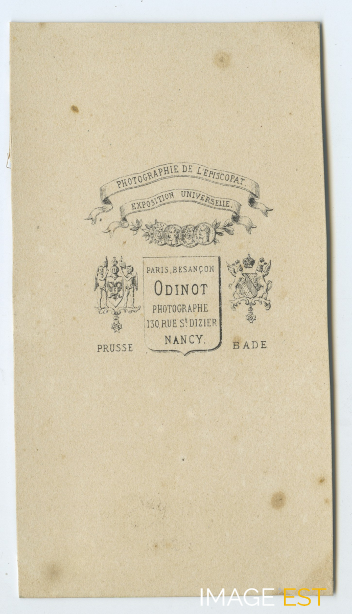 Portrait-carte de visite de la Maison Odinot, installée 130 rue Saint-Dizier à Nancy (Meurthe-et-Moselle). Cette photographie est extraite d'un album contenant des portraits de nombreux prêtres ayant exercés dans le département des Vosges entre 1870 et 1910 environ.