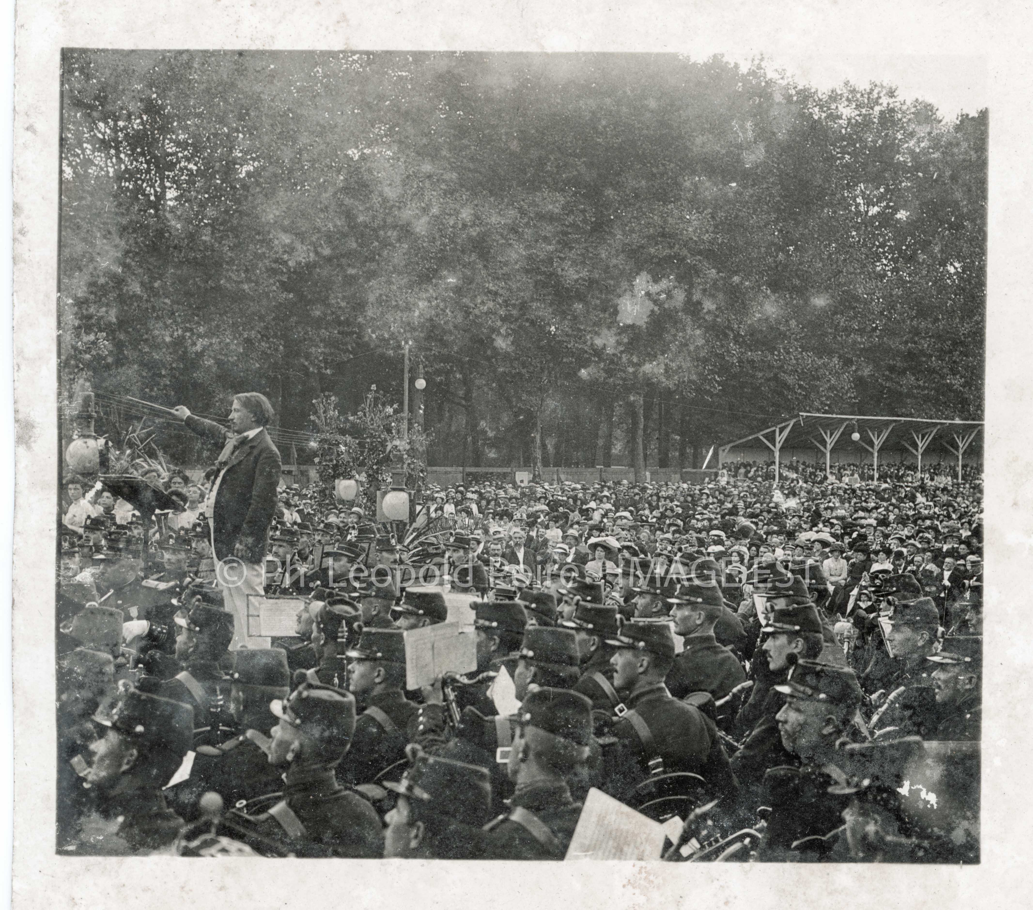 Gustave Charpentier (1860-1956) dirigeant un orchestre militaire au parc de la Pépinière à Nancy (Meurthe-et-Moselle), à l'occasion de la Fête du couronnement de la muse du peuple durant l'Exposition internationale de l'Est de la France le 15 août 1909.Une photographie identique à celle-ci existe sous la cote FI-0574-3417.