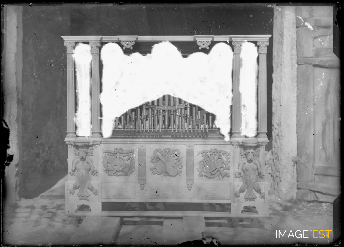 Orgue mécanique à cylindre réalisé par la manufacture d'orgues " Poirot Frères " à Mirecourt (Vosges). La photographie a été prise à la sortie de l'atelier, pratique courante au sein de l'entreprise " Poirot Frères ". Ces clichés datent majoritairement des années 1880-1890. L'histoire de la famille Poirot est développée dans la légende de la photographie cotée FI-1297-0001. Cet orgue ne possède pas de couronnement. La façade est organisée en trois compartiments, les parties latérales étant délimitées par des colonnes. Malgré l'état altéré de la photographie, on suppose un ensemble de trompettes au centre de l'instrument. Un bandeau porte l'inscription " Mirecourt Poirot Frères Vosges ". Le buffet est richement sculpté. Les parties latérales présentent des figures animales hybrides évoquant des monstres, tandis que la partie centrale comporte trois éléments sculptés décorés d'instruments de musique croisés.