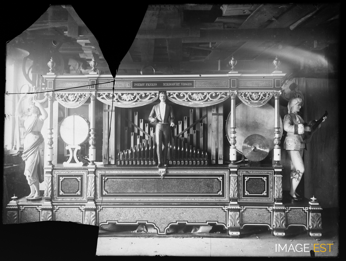 Orgue mécanique à cylindre réalisé par la manufacture d'orgues " Poirot Frères " à Mirecourt (Vosges). Ces instruments, commercialisés sous l'appellation " concert militaire ", étaient principalement destinés aux forains, mais pouvaient également être installés dans les kiosques des parcs urbains afin d'animer les promenades publiques. L'histoire de la famille Poirot est développée dans la légende de la photographie sur plaque de verre cotée FI-1297-0001. Une inscription est visible dans la partie supérieure de l'instrument : " Concert Harmonie Poirot Frères Mirecourt Vosges Médaille d'or ". Il est soutenu par quatre colonnes et présente trois personnages. Au centre, on distingue une figure masculine représentant un chef d'orchestre, ainsi que deux figures latérales qui semblent être beaucoup plus grandes que le personnage central. Ces figures correspondent à des automates animés, actionnés par un système pneumatique alimenté par l'air du soufflet, parfois complété par des transmissions mécaniques. On devine deux tambours intégrés à la façade de l'instrument. Le buffet contient des panneaux rectangulaires ornés de motifs géométriques.