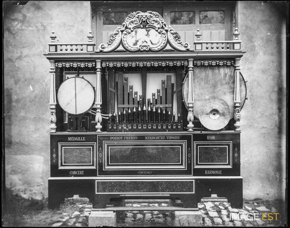 Orgue mécanique à cylindre réalisé par la manufacture d'orgues " Poirot Frères " à Mirecourt (Vosges). La photographie a été prise à la sortie de l'atelier, pratique courante au sein de l'entreprise " Poirot Frères ". Ces clichés datent majoritairement des années 1880-1890. L'histoire de la famille Poirot est développée dans la légende de la photographie cotée FI-1297-0001. Le couronnement est surmonté d'un masque sculpté évoquant une figure monstrueuse à cornes, accompagné de motifs végétaux sculptés. Sous ce couronnement, apparaît un élément central décoré de motifs végétaux, encadré par deux éléments évoquant des rambardes décoratives. La façade de l'instrument est divisée en trois registres séparés par des colonnes : les compartiments latéraux présentent des tambours, tandis que la partie centrale contient un ensemble de tuyaux. Le buffet comprend des panneaux rectangulaires accompagnés de l'inscription " Médaille d'or Poirot Frères Mirecourt Vosges Concert Harmonie ".