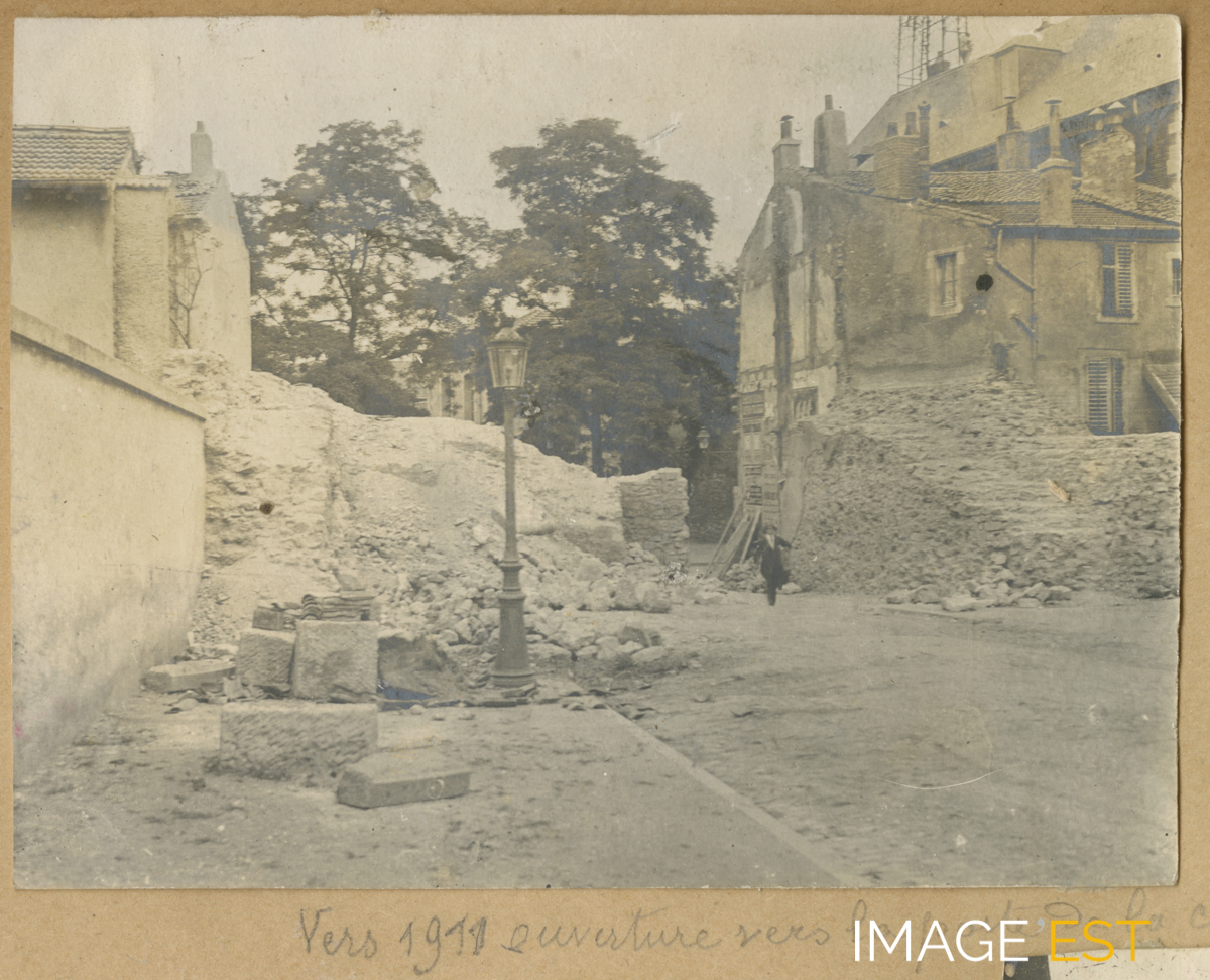 Destruction d'un rempart et ouverture vers la porte de la Craffe à Nancy (Meurthe-et-Moselle). Une mention manuscrite précise : " Vers 1911 ouverture vers la porte de la Craffe ".