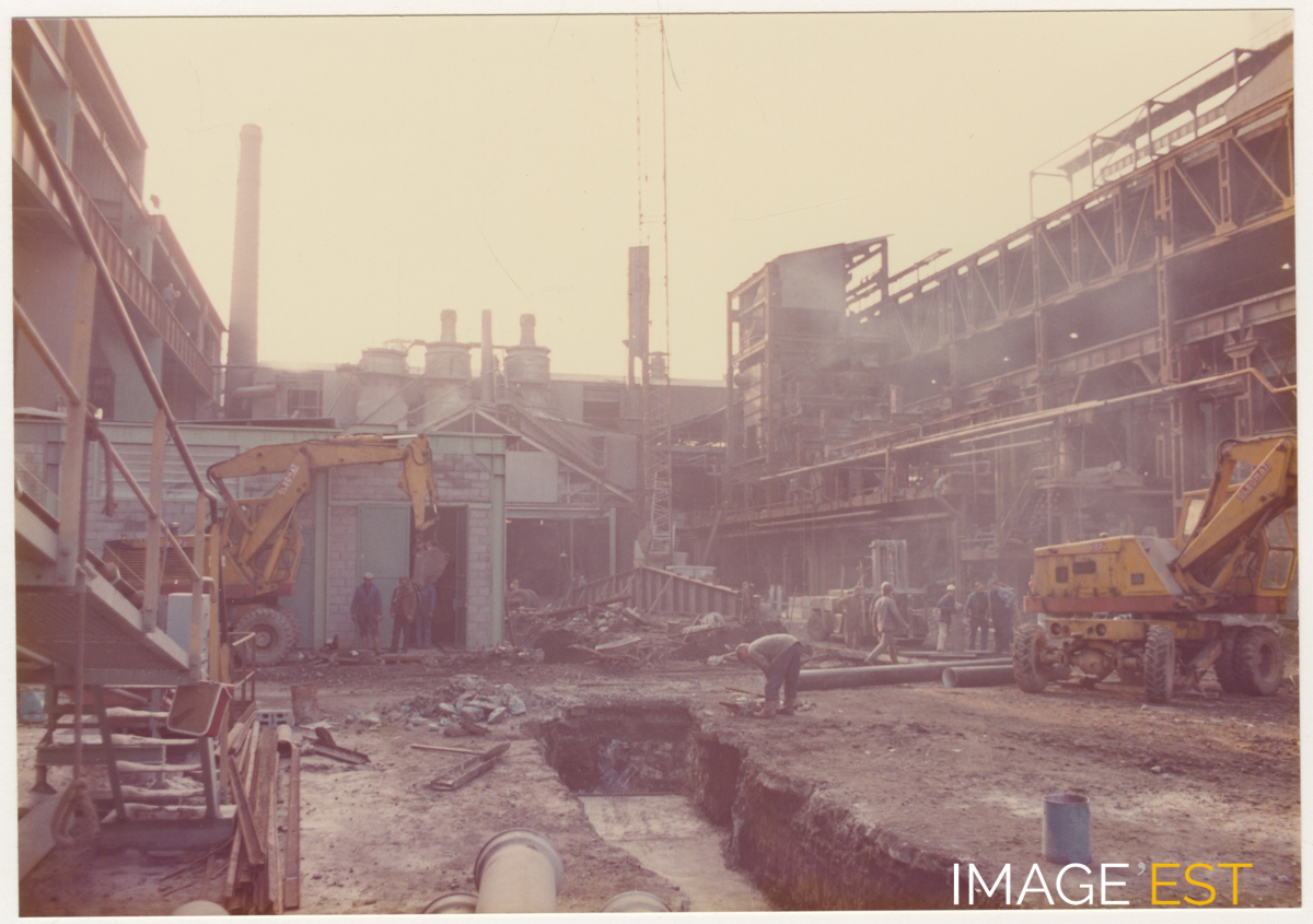 Ouvriers sur un chantier près d'un bâtiment industriel de l'usine de Pont-à-Mousson (Meurthe et Moselle) le 21 février 1974.