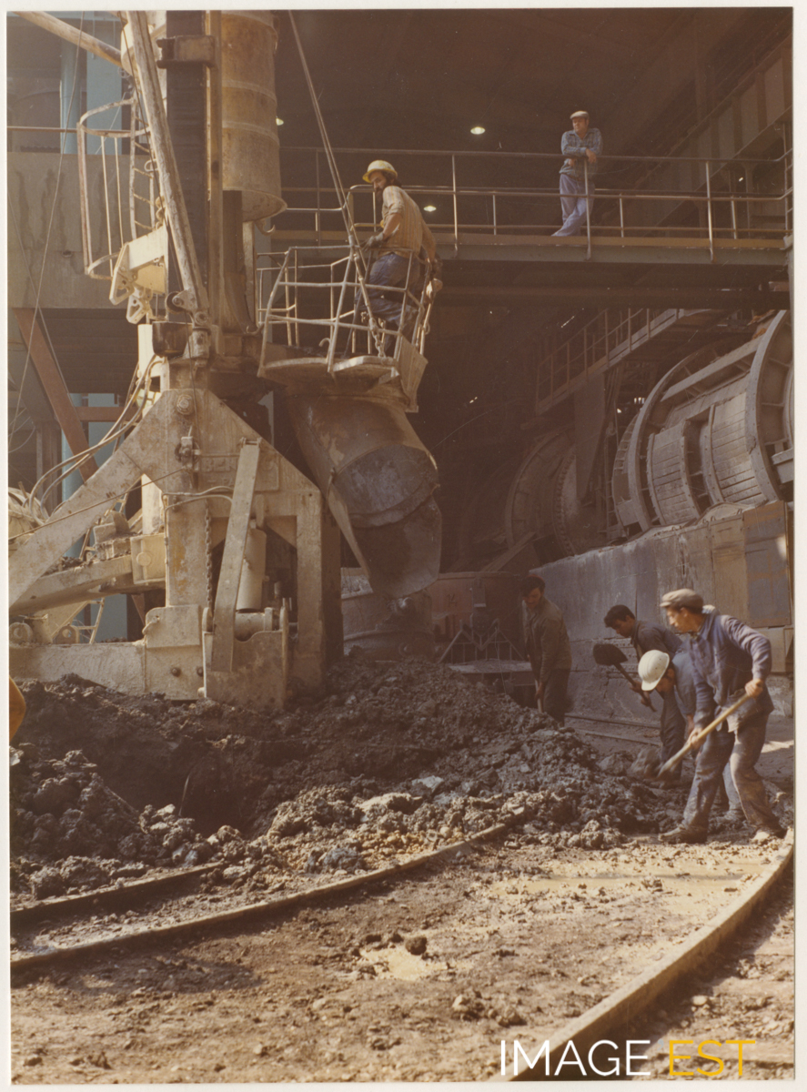 Ouvriers évacuant des gravats près d'un bâtiment industriel de l'usine de Pont-à-Mousson (Meurthe et Moselle) le 26 mai 1974.