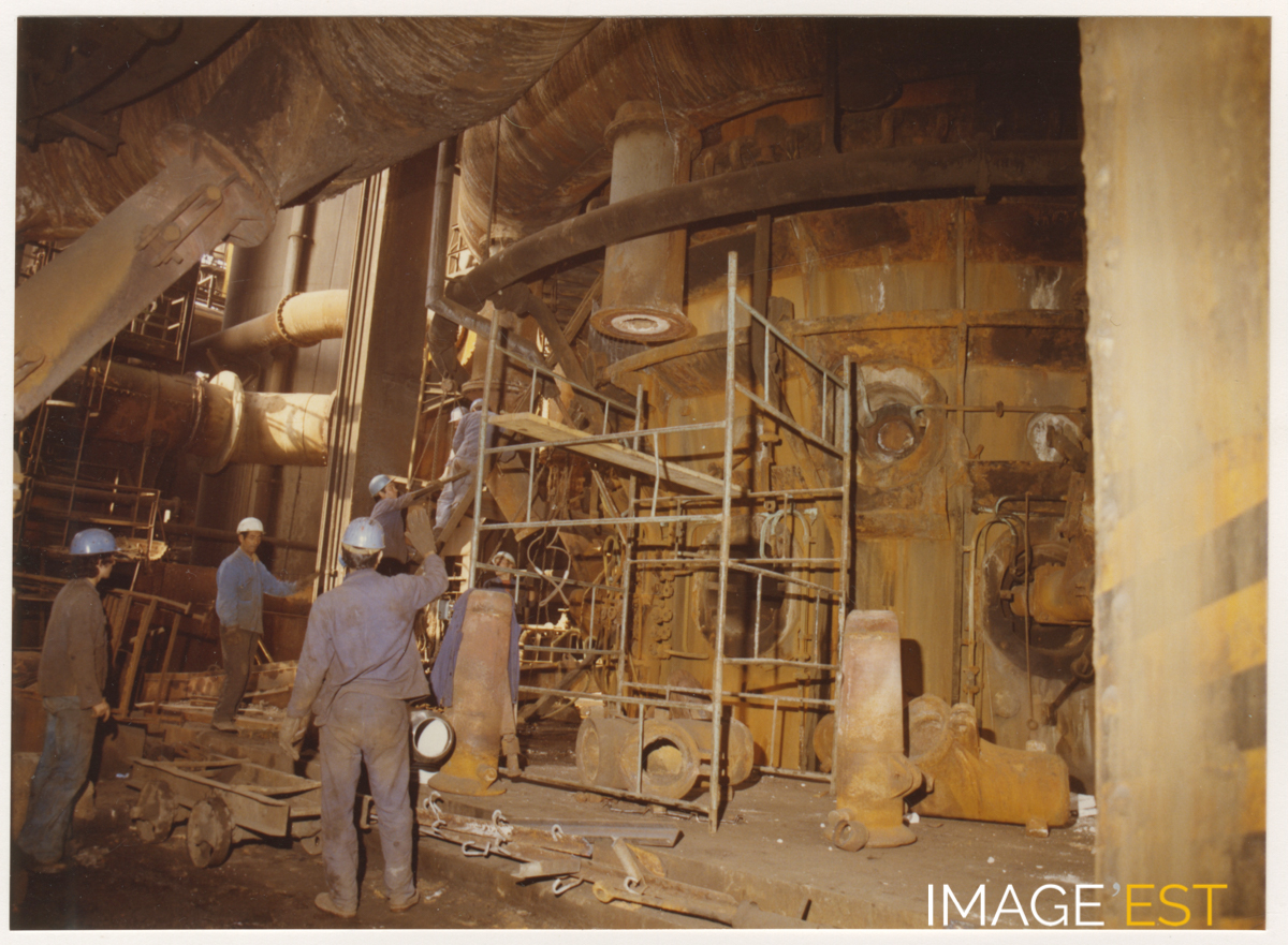 Ouvriers au travail près d'un haut fourneau de l'usine de Pont-à-Mousson (Meurthe et Moselle) le 21 août 1974.