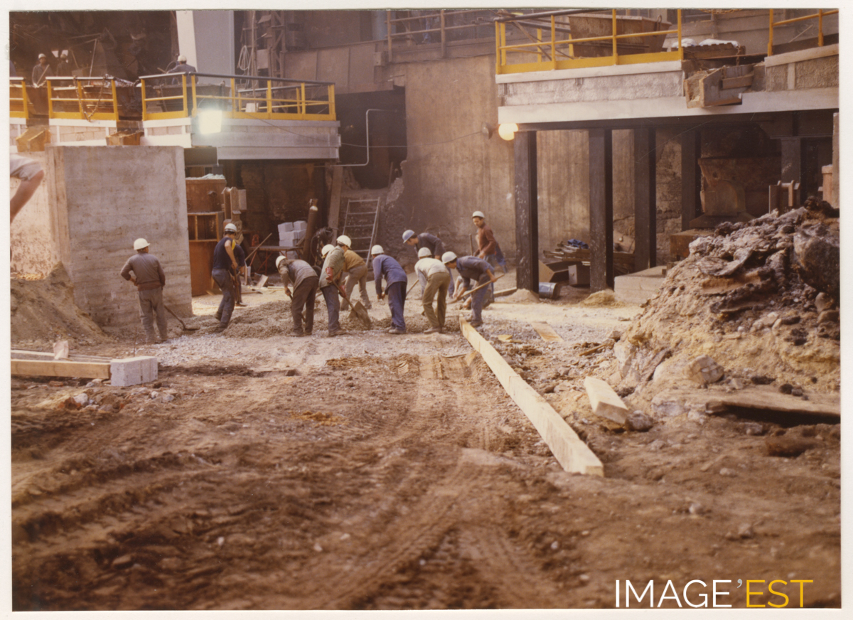 Ouvriers au travail sur un chantier de l'usine de Pont-à-Mousson (Meurthe et Moselle) le 23 août 1974.