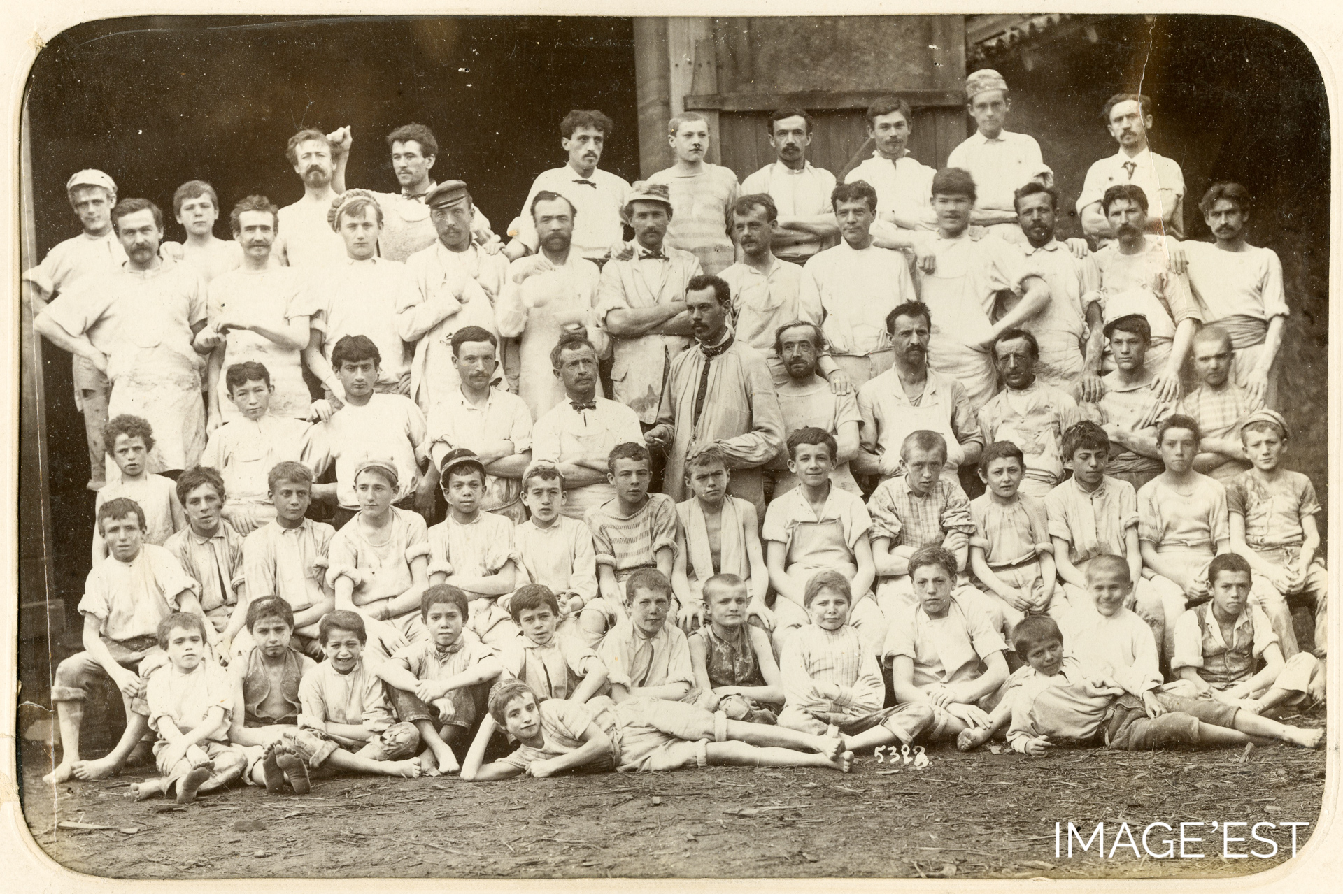 Ouvriers d'un atelier de la faïencerie Keller & Guérin à Lunéville (Meurthe-et-Moselle). Cette photographie, portant le numéro 5323, est extraite de l'album photographique intitulé " Faïencerie Keller & Guérin. Lunéville 1885 ".