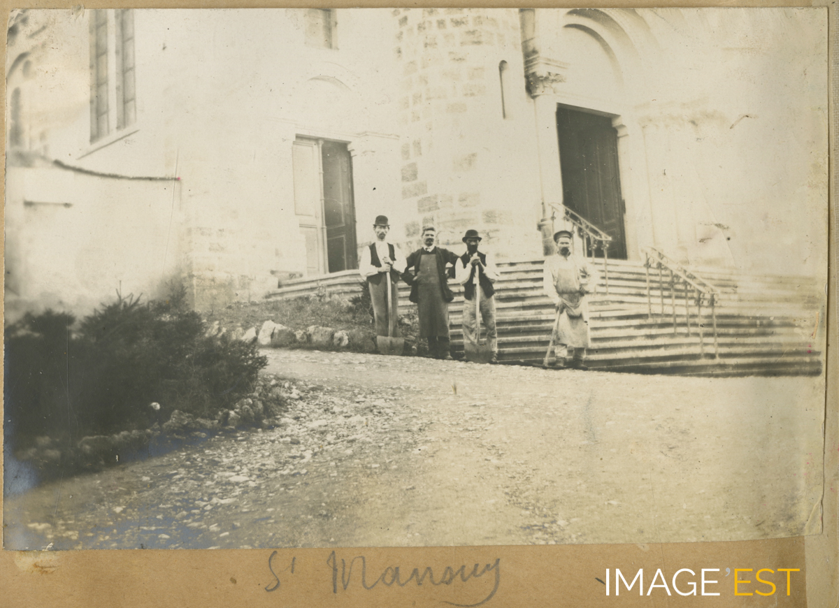 Trois ouvriers en compagnie d'un homme portant un tablier devant l'église Saint-Mansuy à Nancy (Meurthe-et-Moselle).
