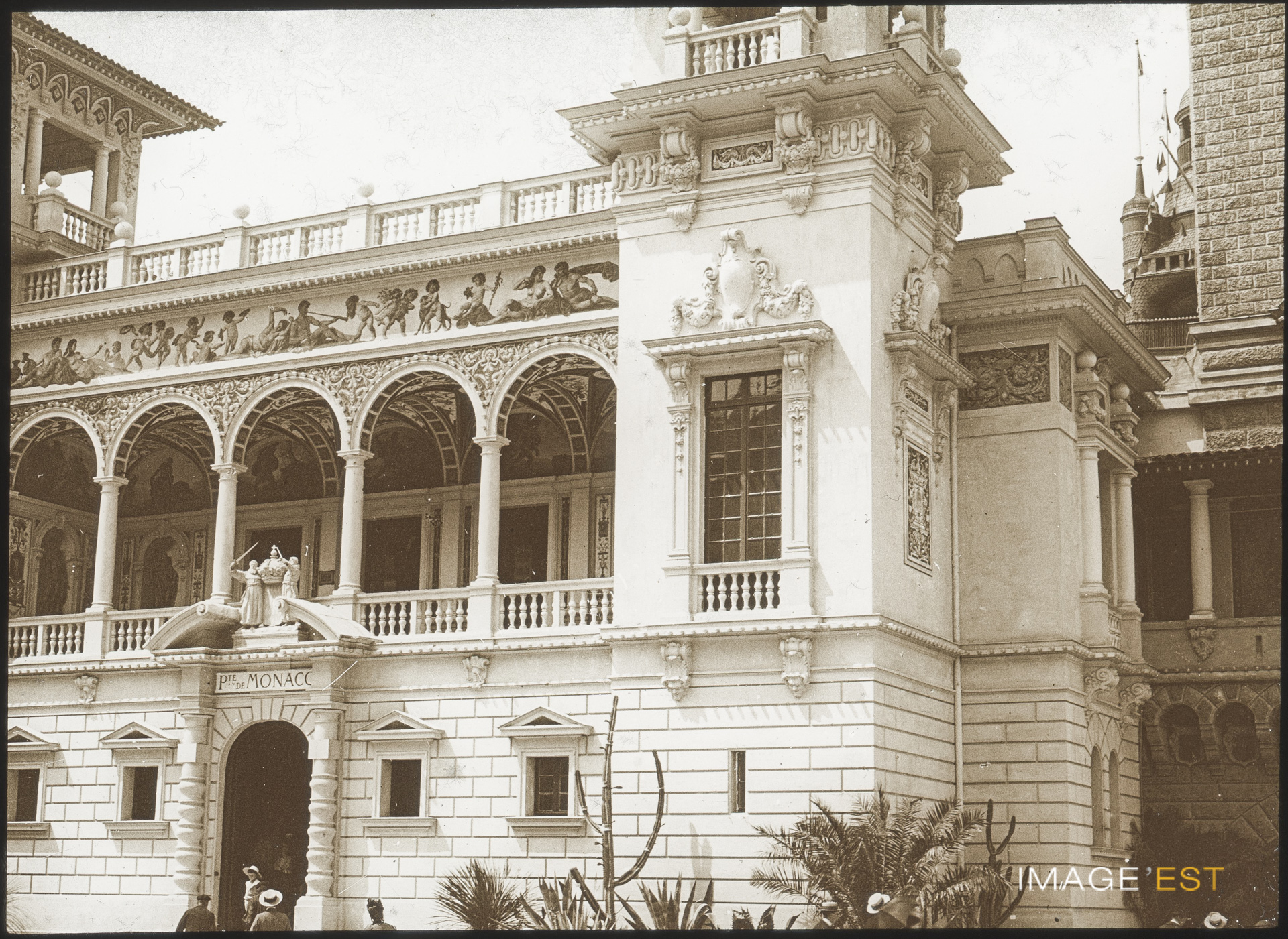 Palais de Monaco lors de l'Exposition universelle à Paris (France). Une mention manuscrite en marge de la plaque de verre indique : " Exp. Paris 1900. Le Palais de la Principauté de Monaco. "