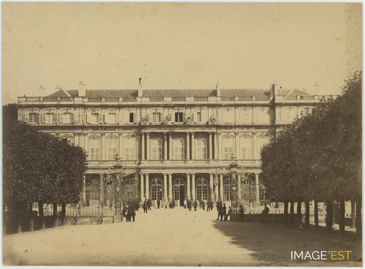 Palais du Gouverneur sur l'hémicycle de la place de la Carrière à Nancy (Meurthe-et-Moselle). Cette photographie pourrait être attribuée au photographe professionnel Félix Roy (1862-1930), membre du Photo-Club nancéien et de la Société lorraine de photographie dès 1896, actif de 1897 à 1920 environ.