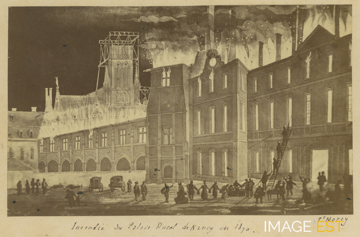 Le Palais ducal après l'incendie dans la nuit du 17 au 18 juillet 1871 à Nancy (Meurthe-et-Moselle). Une mention manuscrite en marge de cette photographie précise : " Incendie du Palais Ducal de Nancy en 1870 ". La Société d'Histoire de la la Lorraine et du Musée Lorrain apporte quelques précisions sur le tragique événement : " Pendant la fatale nuit du 17 au 18 juillet 1871, se manifeste dans l'étage supérieur de la caserne de gendarmerie un effroyable incendie dont la cause est restée un mystère. Maîtresses de la place, les autorités allemandes avaient interdit de la manière la plus absolue tout usage du tocsin, tout signal d'alarme. Privés des secours des pompiers et de leur matériel de sauvetage, les habitants du quartier font des efforts impuissants pour conjurer le fléau. L'abbé Guillaume, au risque de se faire emprisonner, agite la cloche de la chapelle Ducale mais déjà le feu a gagné les combles du musée et en quelques instants l'½uvre de ruine et de dévastation est consommée " (http://www.societe-histoire-lorraine.com/lincendie-de-1871). À remarquer la signature en b. à dr. " Pr Morey " et la mention figurant au bas bas d'un bâtiment du palais au centre : " P. Morey 17 juil. 1871 ".