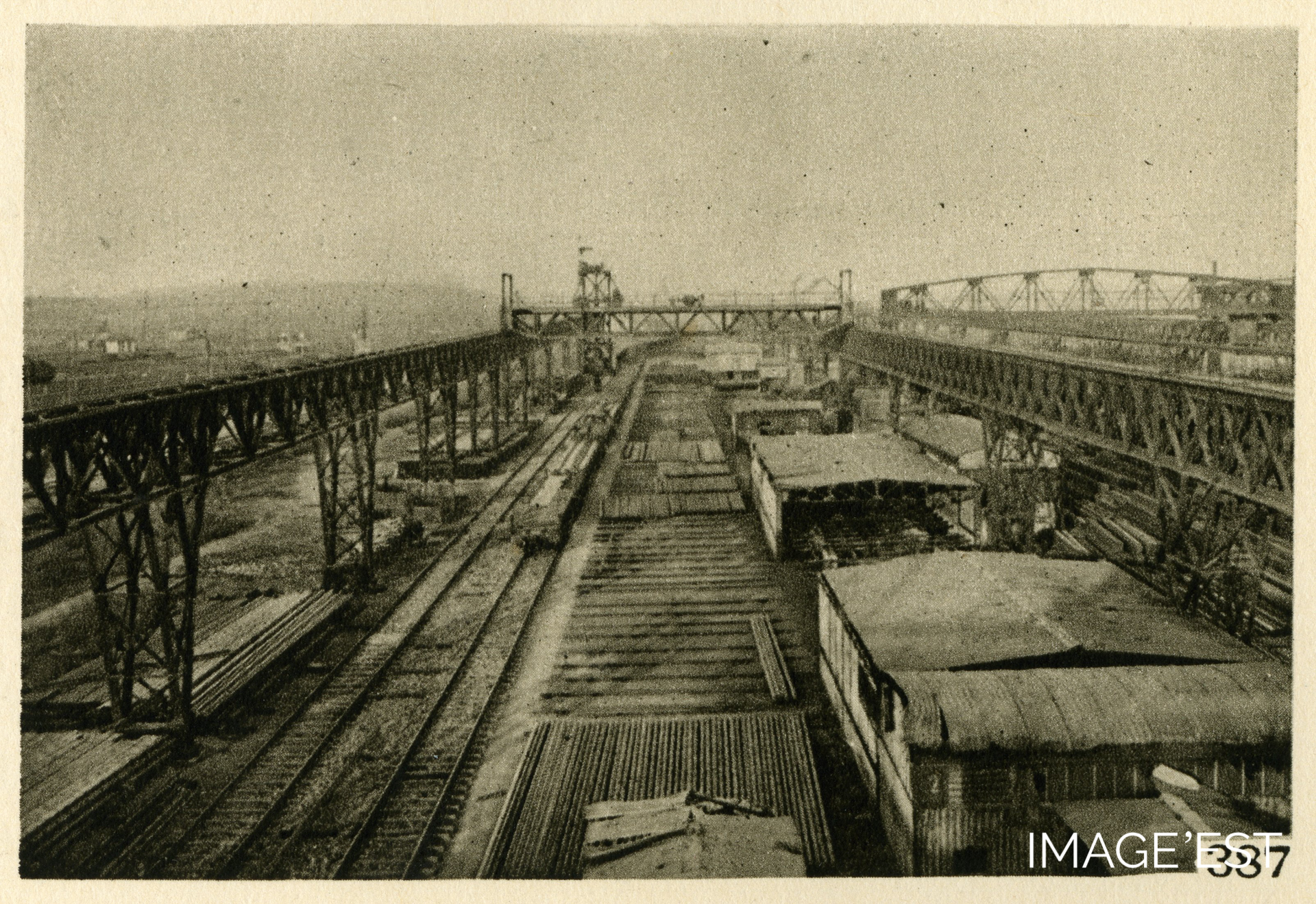 Parc où sont stockés les rails produits aux usines de Mont-Saint-Martin (Meurthe-et-Moselle). Cette photographie est issue de l'ouvrage "Aciéries de Longwy - 1880-1930" imprimé en 50 exemplaires pour commémorer le cinquantième anniversaire de la fondation des Aciéries de Longwy en 1930.