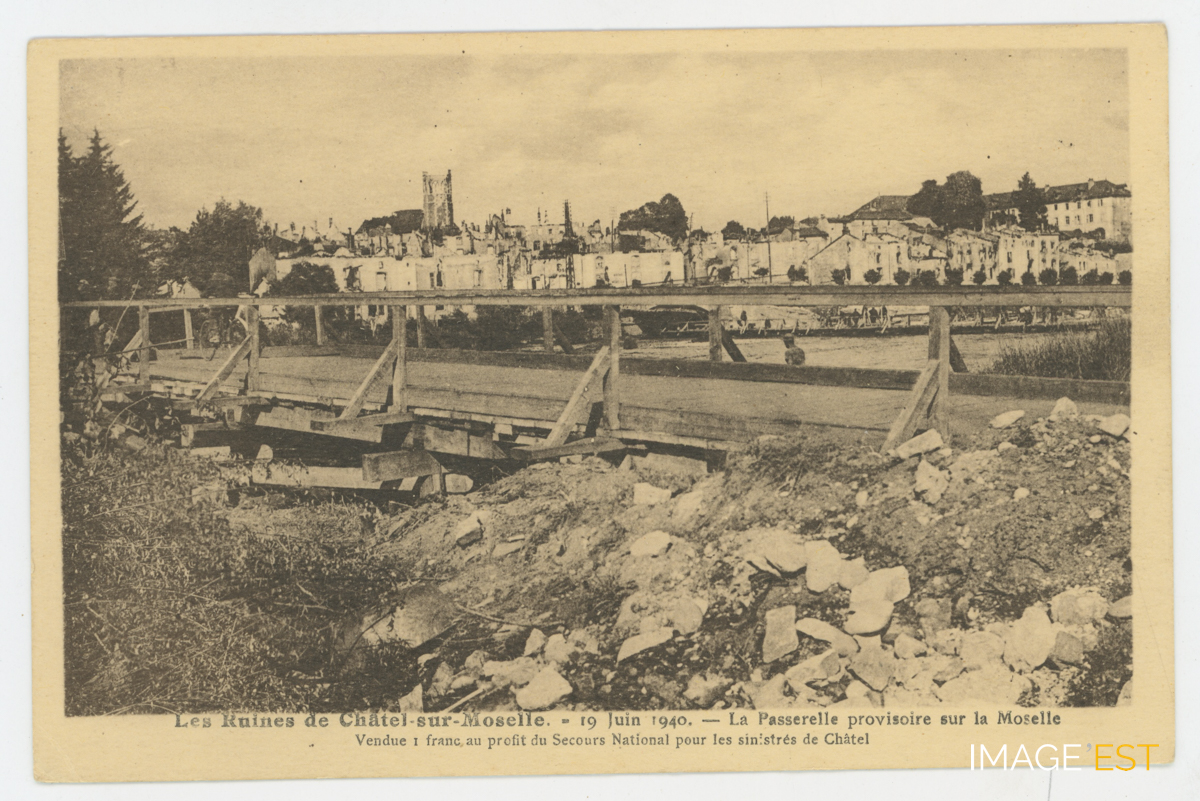 Passerelle provisoire en bois aménagée sur la Moselle à Châtel-sur-Moselle (Vosges), ville détruite par les bombardements de la Seconde Guerre mondiale. La légende de la carte postale précise : " Les ruines de Châtel-sur-Moselle - 19 juin 1940 - La passerelle provisoire sur la Moselle. Vendue 1 franc au profit du Secours National pour les sinistrés de Châtel ".