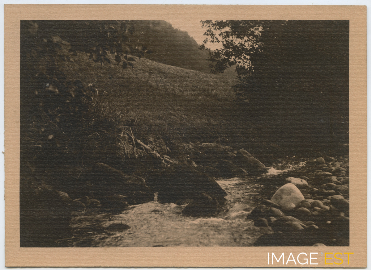 Paysage d'un cours d'eau probablement dans le département des Vosges. Cette photographie est extraite d'un album en cuir repoussé comprenant un ensemble de 48 photographies (format 13 x 18 cm), noir et blanc, illustrant les loisirs et la vie d'une famille aisée probablement dans le département des Vosges à la fin du XIXe ou au début du XXe siècle.