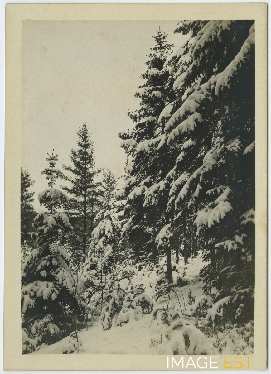 Paysage sous la neige probablement dans le département des Vosges. Cette photographie est extraite d'un album en cuir repoussé comprenant un ensemble de 48 photographies (format 13 x 18 cm), noir et blanc, illustrant les loisirs et la vie d'une famille aisée probablement dans le département des Vosges à la fin du XIXe ou au début du XXe siècle.