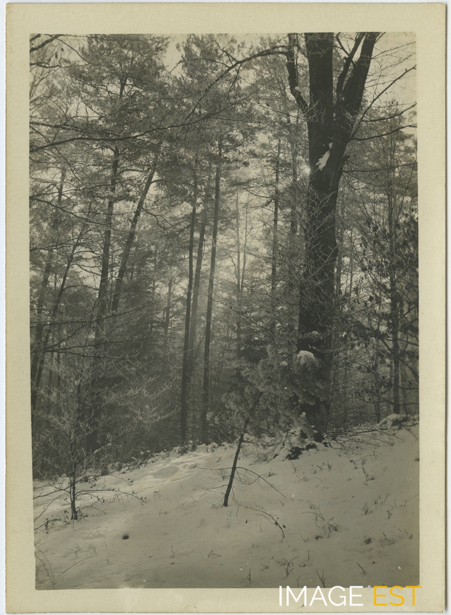 Paysage sous la neige probablement dans le département des Vosges. Cette photographie est extraite d'un album en cuir repoussé comprenant un ensemble de 48 photographies (format 13 x 18 cm), noir et blanc, illustrant les loisirs et la vie d'une famille aisée probablement dans le département des Vosges à la fin du XIXe ou au début du XXe siècle.
