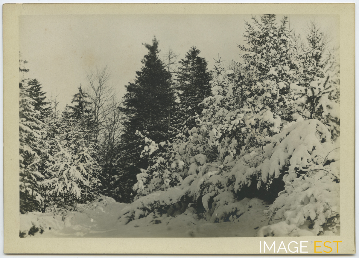 Paysage sous la neige probablement dans le département des Vosges. Cette photographie est extraite d'un album en cuir repoussé comprenant un ensemble de 48 photographies (format 13 x 18 cm), noir et blanc, illustrant les loisirs et la vie d'une famille aisée probablement dans le département des Vosges à la fin du XIXe ou au début du XXe siècle.