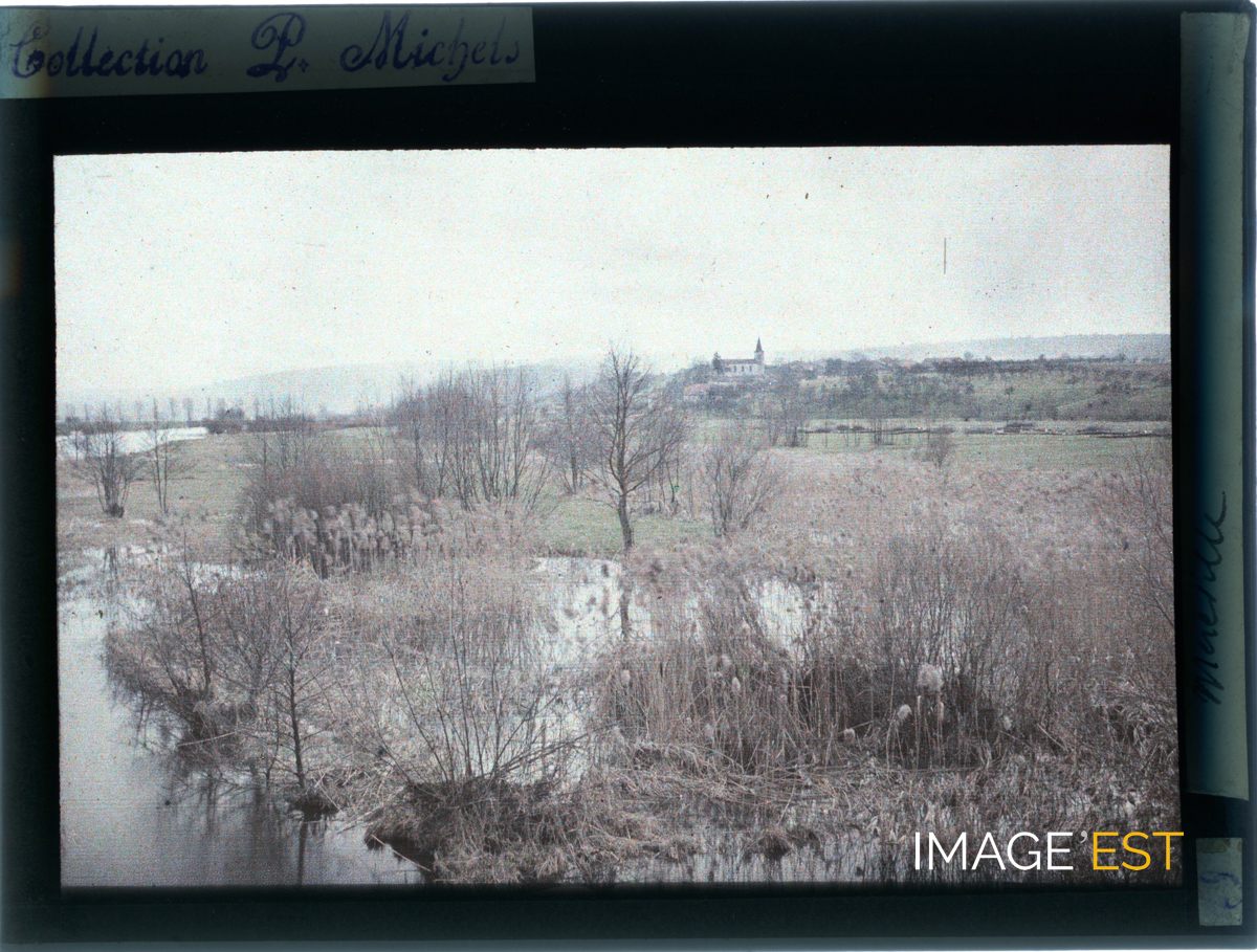 Paysage rural à Méréville (Meurthe-et-Moselle). À la'arrière-plan, l'église Saint-Georges de Richardménil (Meurthe-et-Moselle). Une mention manuscrite figure en marge de la plaque de verre autochrome : " mereville - 9 ".